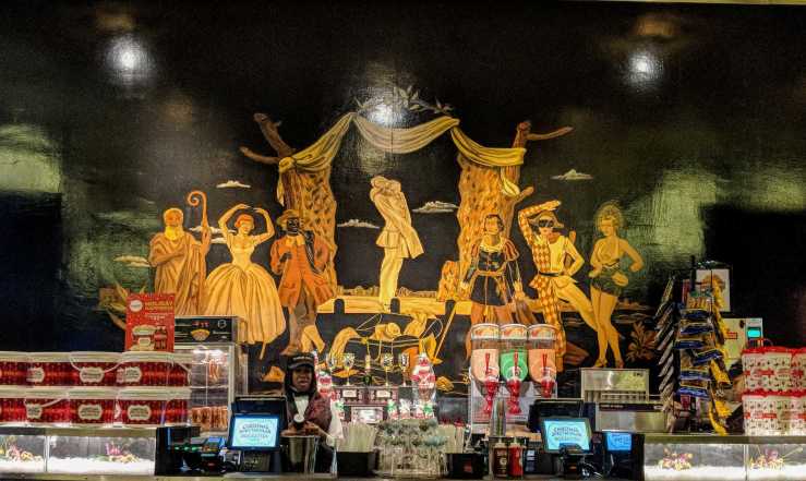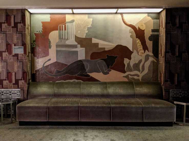 The Spirit of Dance, Aluminium Sculpture, 1932 – by William Zorach. This was one of three statues removed from the Music Hall just before its opening, because they were considered risqué. They were later reinstalled after several months, following strong criticism.The Phantasmagoria of the Theater by Louis Bouche, at the main lounge of Radio City Music Hall.