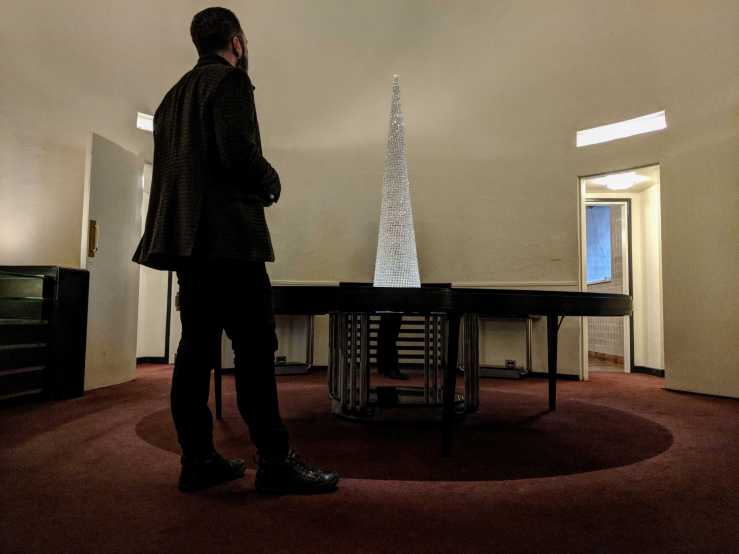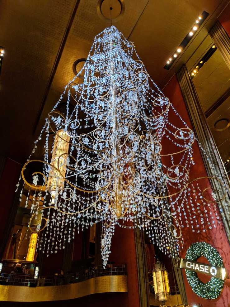 The crystal Christmas Tree stealing the limelight from the chandeliers and Ezra A. Winter’s epic mural that overlooks the grand foyer. ”The Fountain of Youth”, 1932, is one of the first commissions for the Music Hall and depicts a legend from the Oregon Indians about the beginning of time.