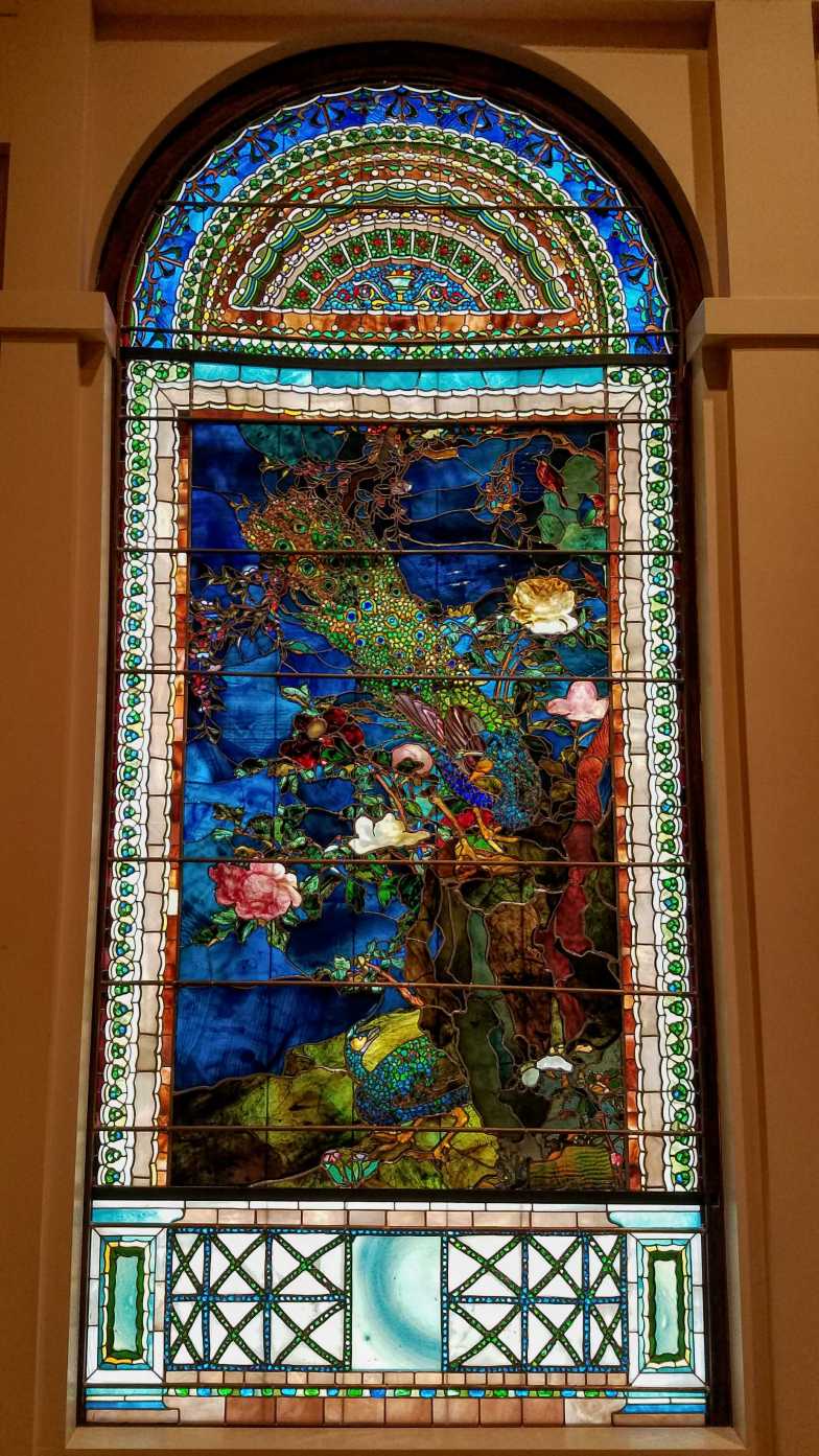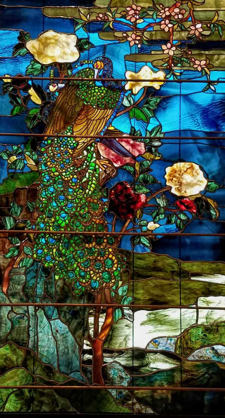 John La Farge’s stained glass windows reflect the Gilded Age fascination with medieval art and craftsmanship. The tail feathers of the peacocks are made of bits of glass in the ”broken jewel” technique; each peony blossom is a single piece of glass molded to catch the light differently through the day. La Farge layered his coloured glass as a painter would build glazes of colours to achieve the right shade. For the composition, he borrowed from many cultures: the central panels with the bird and flower motif evoke Chinese and Japanese screens; the lower panels emulate Pompeiian architecture; and the transoms recall the curved arch above the door to a Romanesque cathedral.