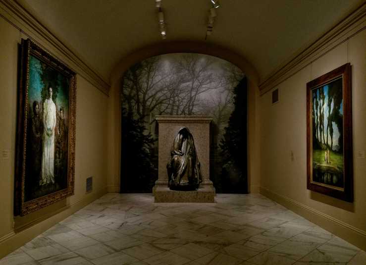 Marian ”Clover” Hooper Adams, wife of writer Henry Adams, committed suicide in 1885 by drinking chemicals used to develop photographs [Clover was a skilled autodidact photographer]. Her grieving husband commissioned sculptor Augustus Saint-Gaudens to create a memorial that would express the Buddhist idea of nirvana, a state of being beyond joy and sorrow. In Adams’ circle of artists and writers, the old Christian certainties seemed inadequate after the violence of the Civil War, the industrialization of America, and Darwin’s theories of evolution.