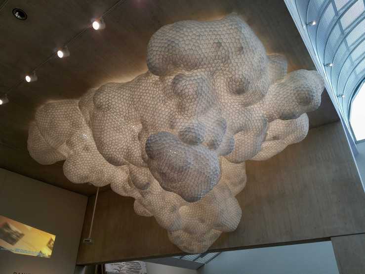This undulating lattice of styrofoam drinking cups with glowing hollows and pliable rims was made to expand into the architecture of this particular space. To discover how they react to light and space in transcendent ways, Donovan experiments with huge volumes of manufactured materials. Clustered with an almost viral repetition, the cups above assume forms that both evoke natural systems and seem to defy the laws of nature. ”My work is mimicking the ways of nature, not necessarily mimicking nature” she notes. Here, it might suggest cellular growth or even the density of molecules in rolling clouds.