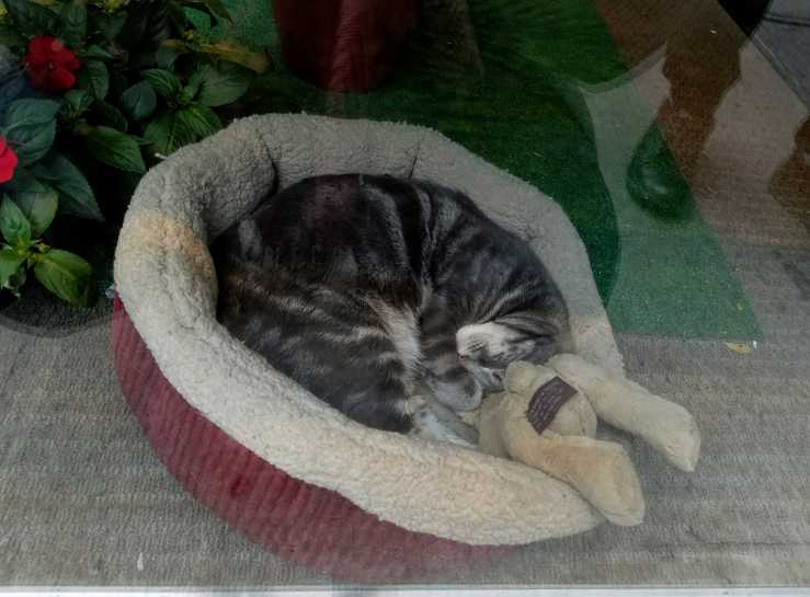 Scotty the Bear (x2) and Cuddly the Cat, at a flower shop window.