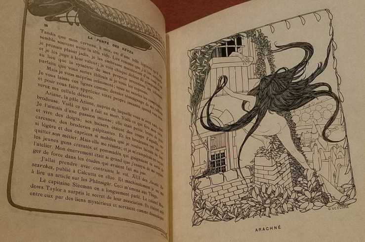 Edgar Allan Poe’s influence on Symbolist literature was most explicit in its prose. In Schwob’s Arachné, a man’s desire to possess his beloved leads him to strangle her to absorb her soul, exhaled in her dying breath. Things backfire. Transformed into a spidery creature, she uses his rope to ensnare him, confining his body and silencing his speech. Schwob’s fiction reflects a coterie of misogyny in the Symbolist movement. These authors explored the sinister artifice and automaton-like qualities of women as femmes fatales. Publisher Octave Uzanne, who relished the movement’s darker side, enlisted de Feure to illustrate Schwob’s fantastic tales for a livre de luxe. The artist’s elaborate ornamental borders, which manifest a stylistic progression from Symbolist decoration to Art Nouveau, were the only elements the writer praised.