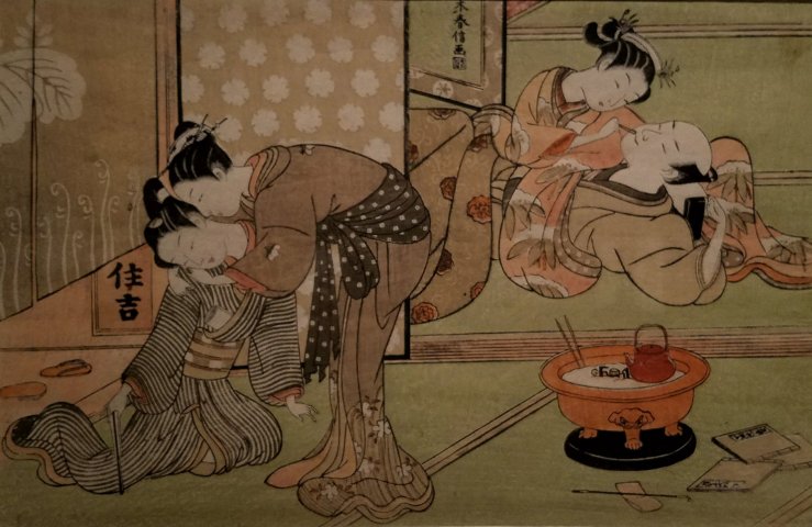 Two separate encounters in a brothel are staggered across this skillfully composed print by Harunobu. In the background, an adult man with a fully shaved pate is having his moustache tweezed by a female prostitute, an act of intimacy. In the foreground, a slightly more mature prostitute attempts to woo a coy young wakashu who fiddles with a folded fan and diffidently resists her embrace.