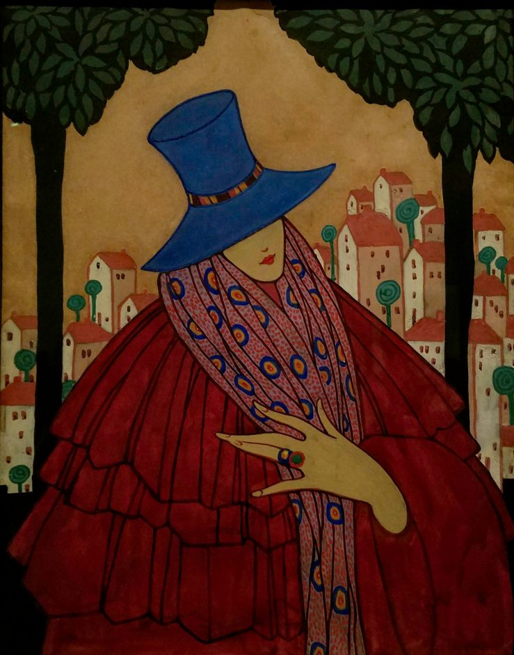 O’Keeffe may have created this watercolour for classroom use. The work demonstrates the application of flat, stylized designs of fashion illustration. In this same period, the magazine Vanity Fair published similar stylized illustrations by O’Keeffe, who was searching for additional ways to turn her art skills into income.