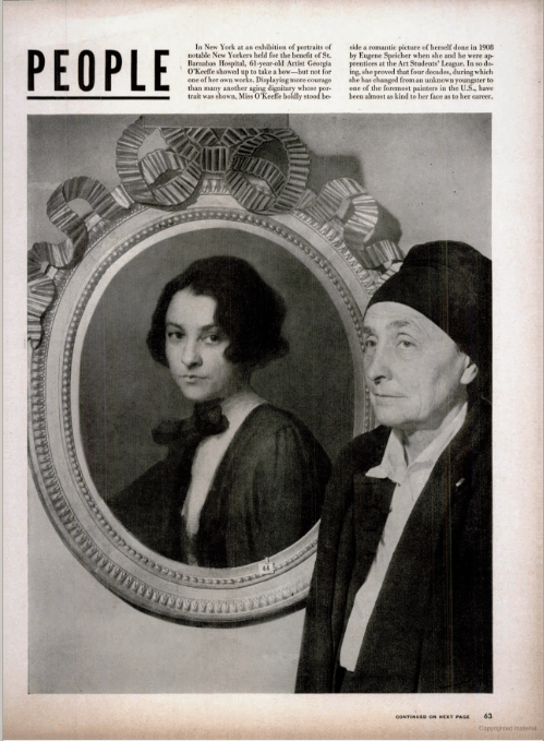 When Eugene Speicher, an older student at the Art Students League, asked O’Keeffe to model for him, she wore a three-piece outfit associated with the so-called New Woman: a white shirtwaist, black skirt and jacket, and black bow at her neck. This combination allowed women to move with greater ease than in conventional Victorian dresses and was a style of reform dress widely endorsed by budding women artists and professionals. In 1948, Life magazine ran an image of the sixty-one-old O’Keeffe posed next to the portrait (in a different frame), noting, ”she has changed from an unknown youngster to one of the foremost painters in the U.S.” Her personal style, however, had remained the same.