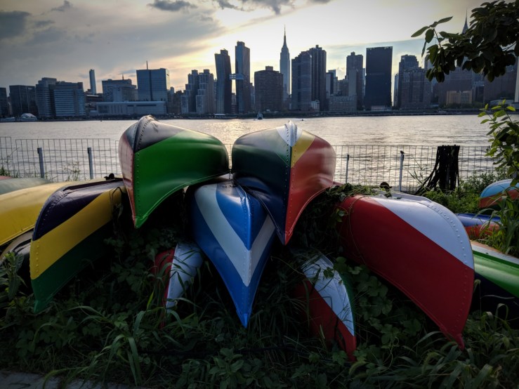 The canoes are part of Xaviera Simmons, Convene, 2018, installation (aluminum canoes, paint and rope) painted with designs that abstractly and explicitly evoke national flags symbolic of the diverse historical and contemporary demographic makeup of Astoria and Long Island City.