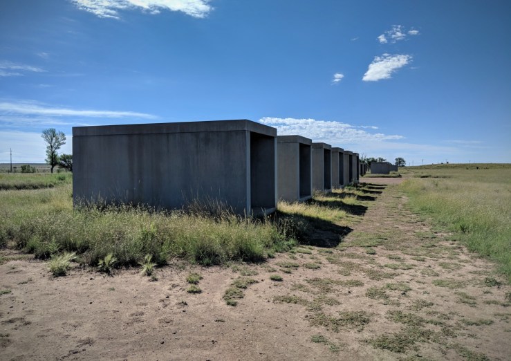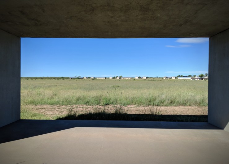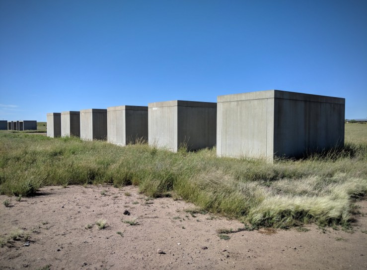 “The fifteen concrete works by Donald Judd that run along the border of Chinati’s property were the first works to be installed at the museum and were cast and assembled on the site over a four-year period, from 1980 through 1984. The individual units that comprise each work have the same measurements of 2.5 x 2.5 x 5 meters, and are made from concrete slabs that are each 25 centimeters thick. Funding for the project was provided by the Dia Art Foundation.”