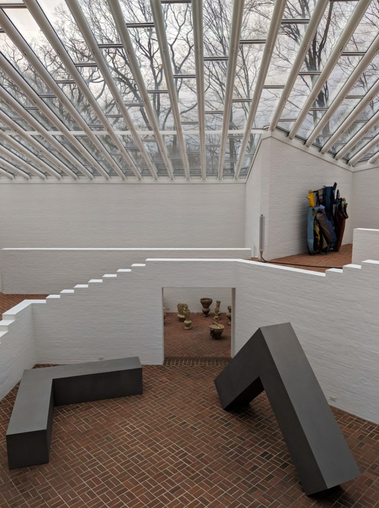 While the Painting Gallery was inspired by an ancient Greek Tomb, Johnson looked to modern Greece for the design of his Sculpture Gallery. His inspiration came partly from the Greek islands and their many villages marked by stairways. Johnson remarked that in these villages, “every street is a staircase to somewhere.” He liked it so much that he seriously considered moving his residence from the Glass House to the Sculpture Gallery. But then, he thought again: “Where would I have put the sculpture?”