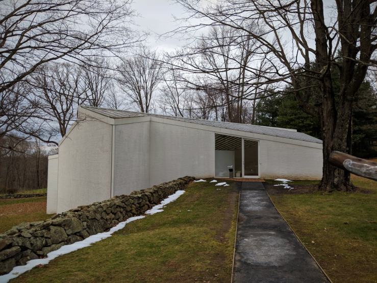 The Studio, a one-room workspace and library, was referred to by Johnson as an ”event on the landscape”. When first completed, the Studio’s stucco exterior was bright white, but later Johnson painted it a soft brown color, described by colorist Donald Kaufman as ”stone greige.”