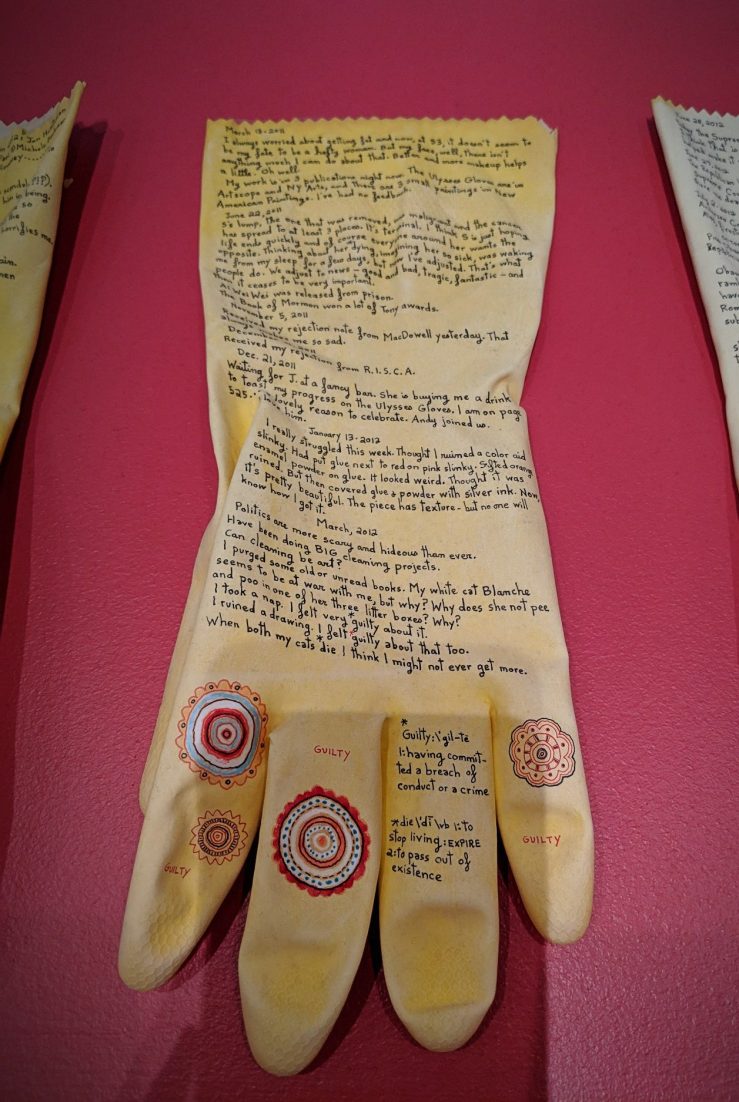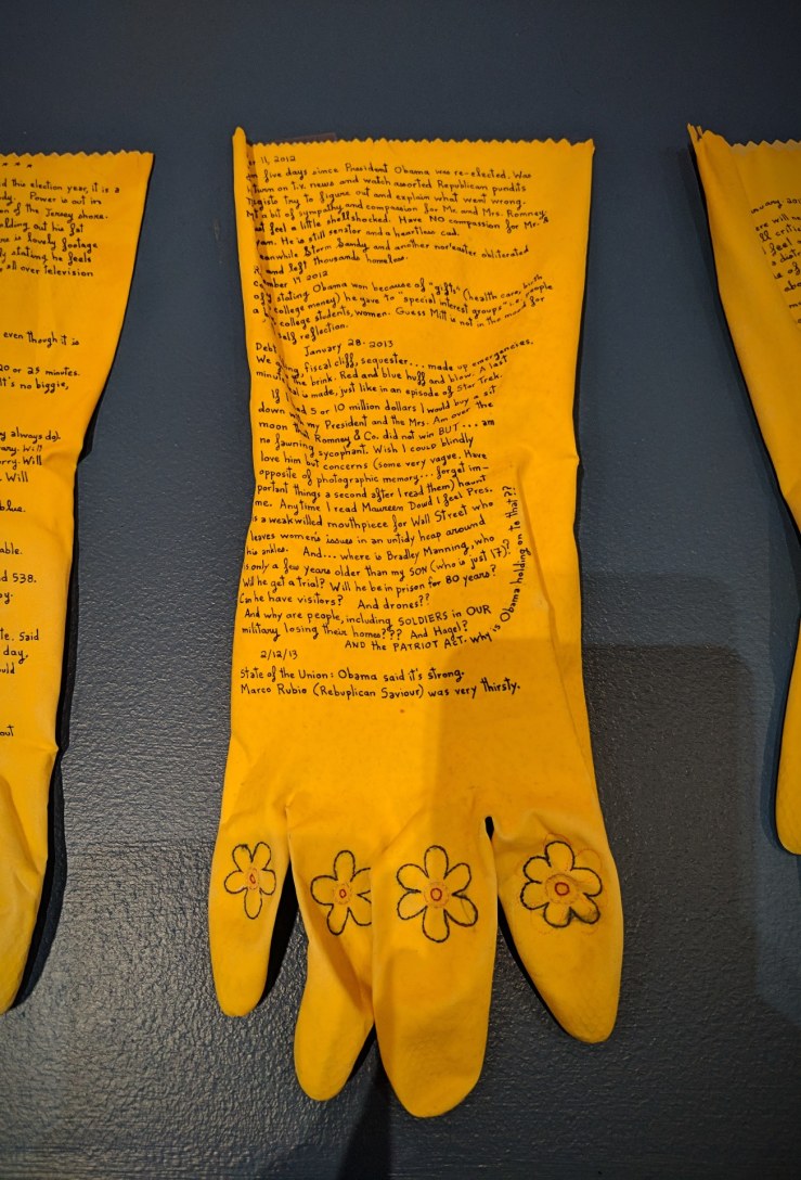 Created during President Obama’s re-election campaign, Rosner’s dishwashing gloves recount her daily chores, creative challenges, and personal anxieties on one side. On the other, she outlines national and international headlines, sometimes critiquing political affairs. This text, initially written in detailed diary entries, was edited and rewritten on the gloves. The faded ink and rubber deterioration remind us that everything is ultimately ephemeral. The more permanent-looking flag, a bandana Rosner bought at the Army/Navy Surplus on Thayer Street, features simplified versions of the dishwashing gloves—a metanarrative on the interconnectedness of personal and political obligations.