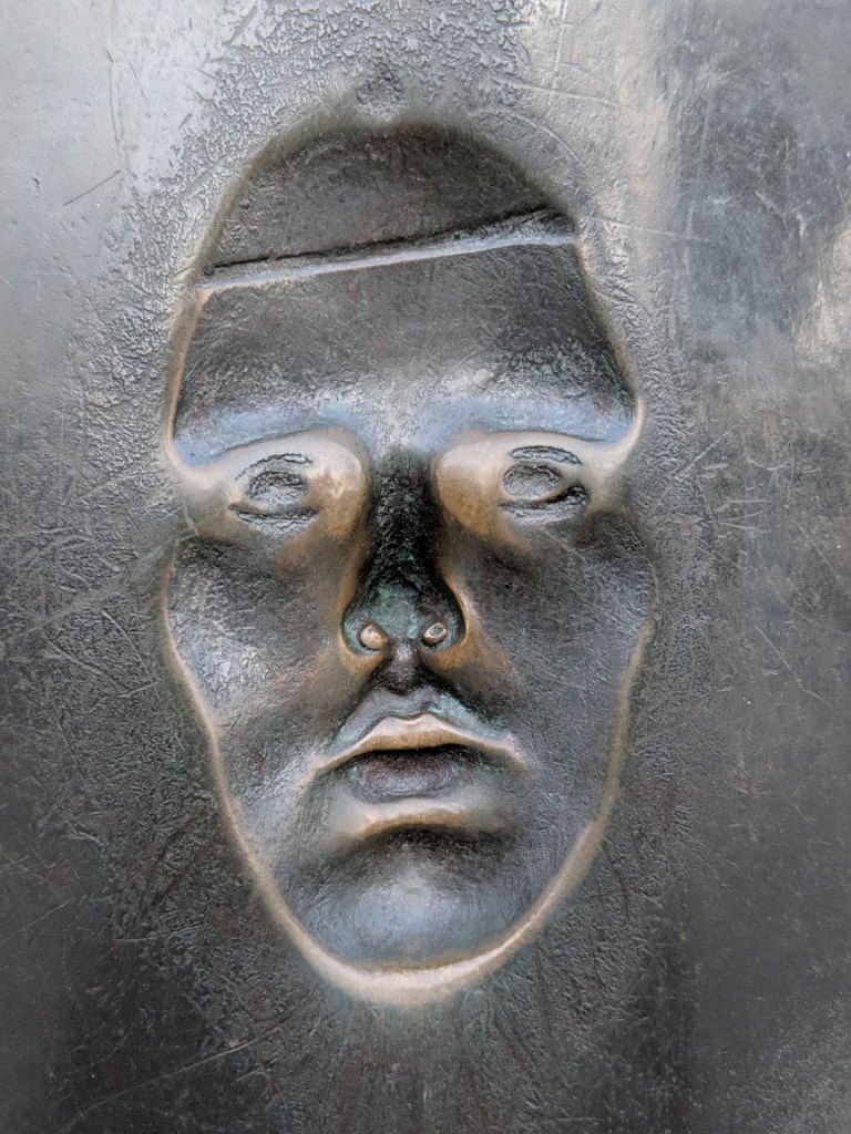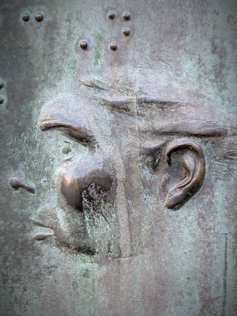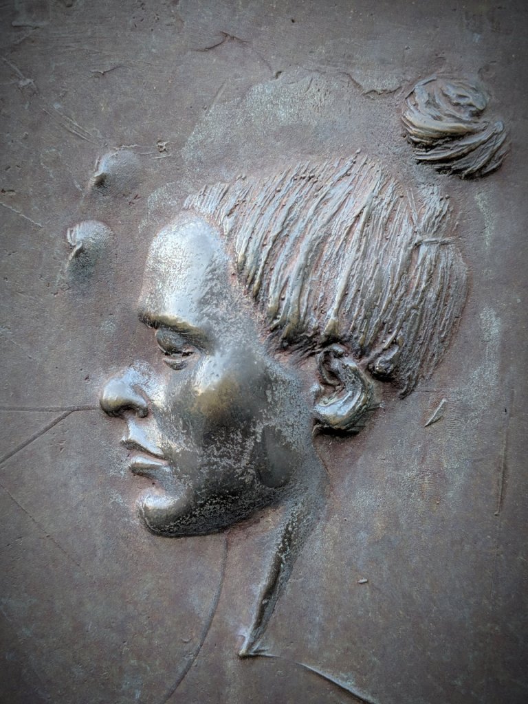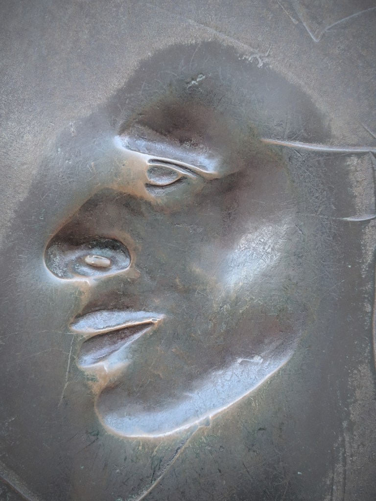 “Social Programs” contains images of the fifty-four programs that were initiated under FDR and the New Deal. Within each panel, individual images symbolize the essence of various innovative programs, set within a background of the hands and faces of workers. The names of each program are also written in Braille. These are organized as five bronze panels, each measuring 6 x 6 feet with five corresponding bronze cylinders, which contain the negative images or molds of the five panels.