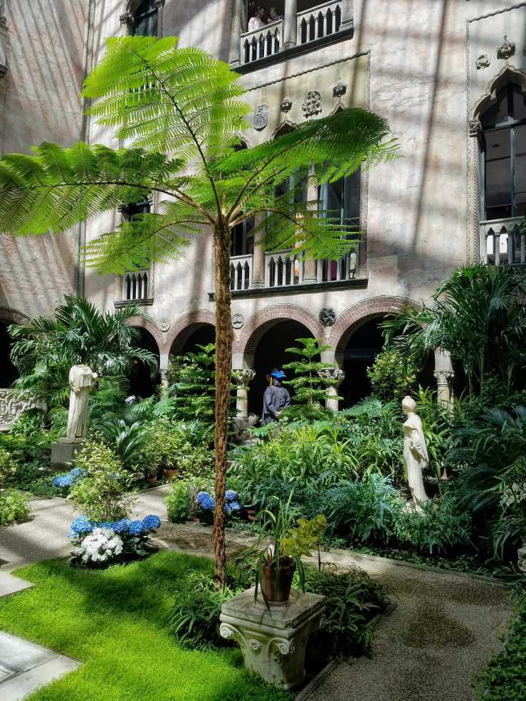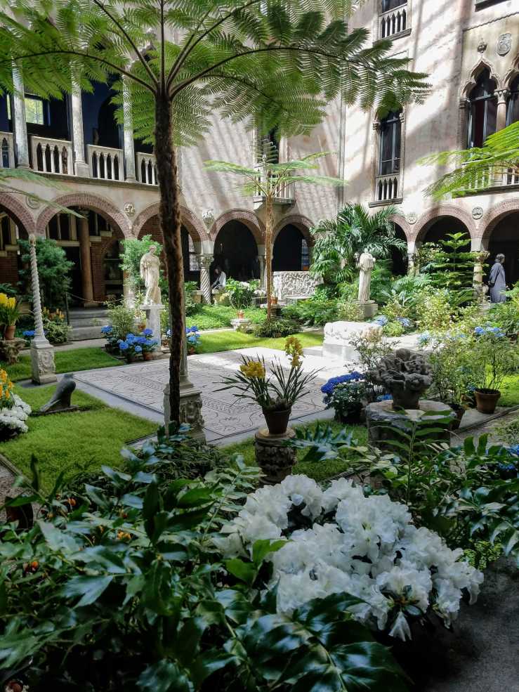 Let us start with the Courtyard, visible from every gallery in the museum, with its Ca’d’Oro balconies dating from 1845-1855 and Roman sculpture garden where plants change almost every month. For most of the them are grown in the Museum’s temperature-controlled Hingham greenhouses, then trucked here on rotation so that the garden is always in full bloom. Notice the hydrangeas in these pictures? They are often grown from cuttings taken the previous year and are on view between May & June.