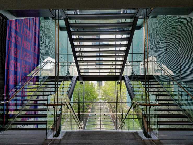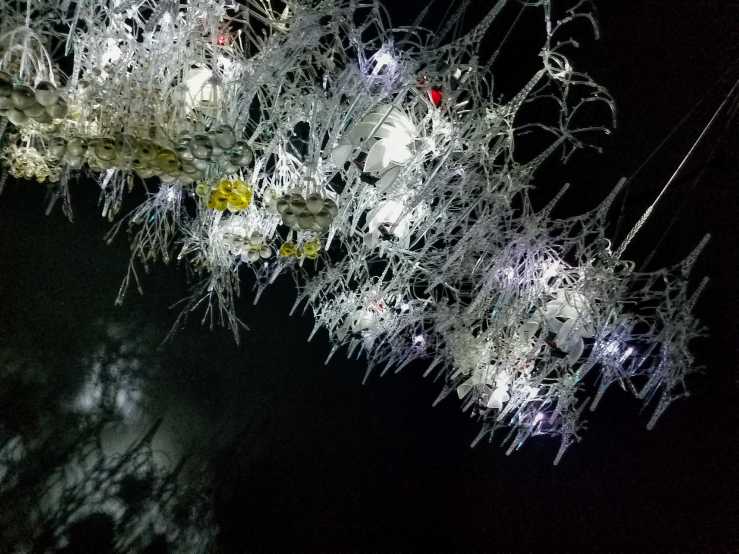This is ”Sentient Veil”, a sculptural sound piece created in 2017, by Philip Beesley (b. 1956). Small glass ampules containing gold and blue liquids hang in clusters from a digitally fabricated textile, along with LED lighting and miniature acoustic resonators. “Sentient Veil” is silent until visitors enter the gallery; movement in the room triggers a mixture of whispers, mechanical clicks and gentle tones, creating a quiet chorus.
