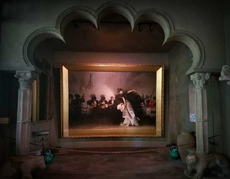 During his travels in Spain in 1879, Sargent was mulling over a major work of art in which he could express his love of Gypsy music, dance, and picturesque costumes. On his return to Paris he set to work on a wide horizontal picture whose proportions simulated the shallow stage space of popular musical establishments. He named the painting El Jaleo to suggest the name of a dance, the jaleo de jerez, while counting on the broader meaning jaleo, which means ruckus or hubbub. The painting was exhibited at the Paris Salon of 1882 with the more explicit title El Jaleo: Danse des gitanes (Dance of the Gypsies).