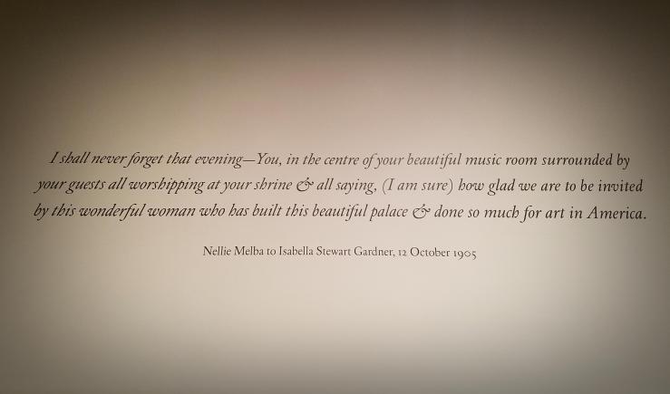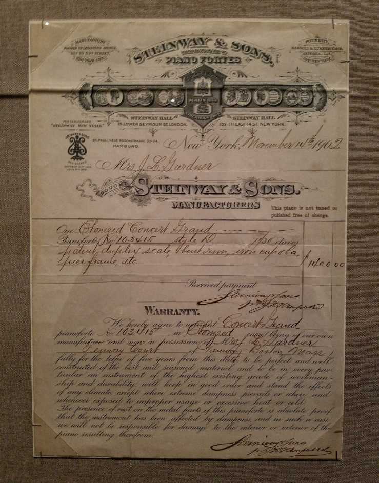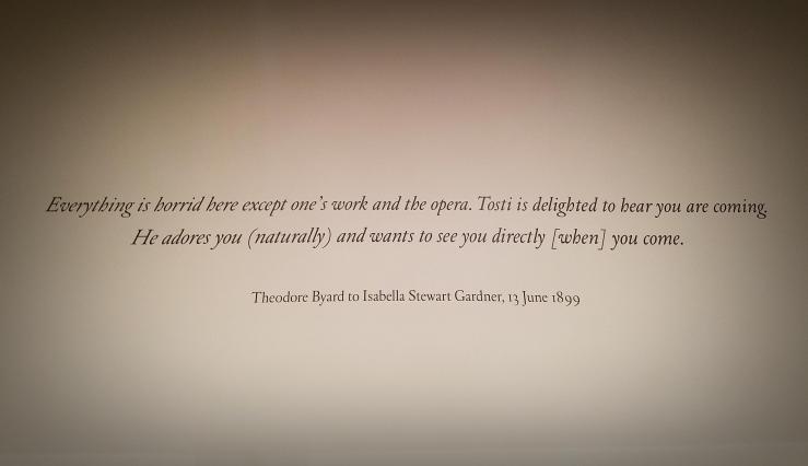 Here we can enjoy a collection of objects related to Gardner’s lifelong love of music. ”An avid traveler, her musical tastes were shaped by experiences around the world. In diaries and letters, Gardner described the sounds of different cultures – from the soaring voices of the Bayreuth Festival in Germany to the raucous singing of boatmen on the Nile. When in Boston, Gardner regularly invited friends and family to concerts at her home, often printing beautiful programs for her guests.”