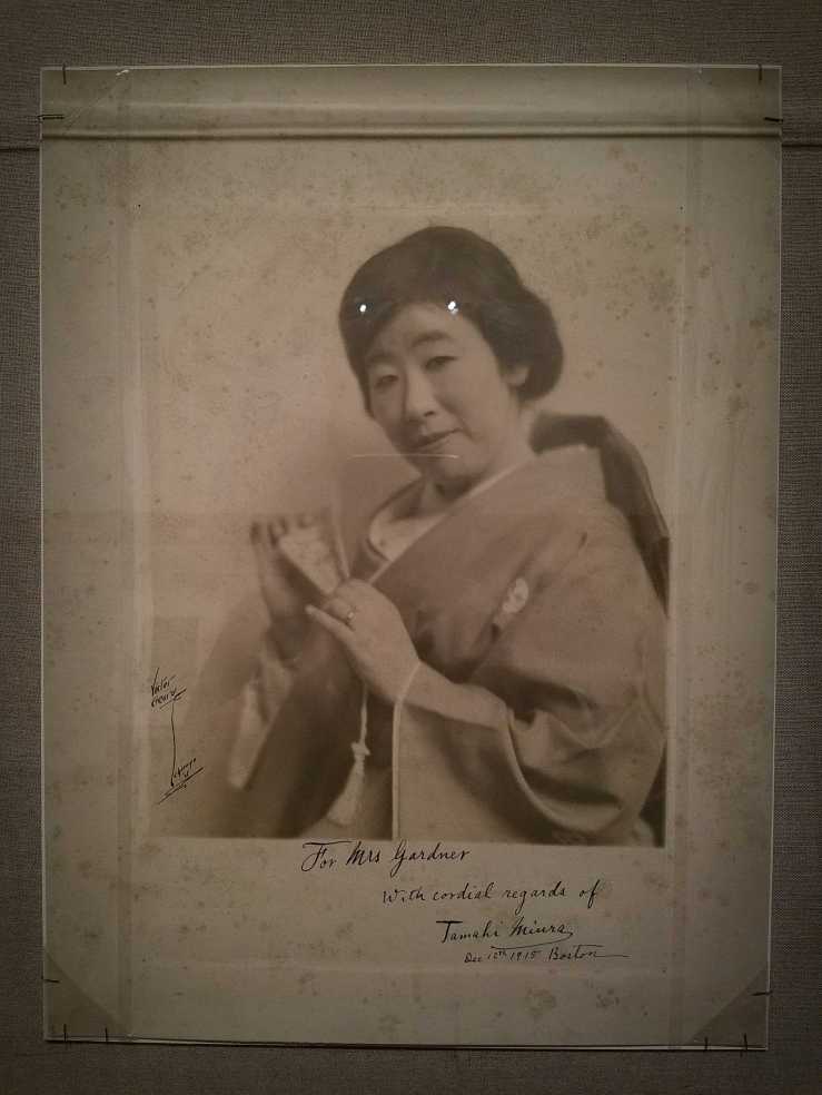 ”Tamaki Miura was the first internationally celebrated Japanese soprano. After training in her native Japan and in Europe, Miura was cast in the title role of Puccini’s Madama Butterfly in London in 1915. Acclaimed for her performances, Miura toured the United States to reprise her role for American audiences. Gardner was a great fan of the opera and friend to many singers; the fact that she collected a photographic portrait of Miura denotes her admiration for the path-breaking soprano.”