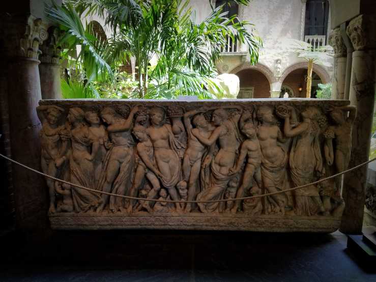 The carving of the satyrs and maenads was especially suited to the artistic tastes of Mannerist and Baroque Rome, providing one of the most elegant examples of Greek imperial optic elongation to have survived from ancient times. The Farnese-Gardner sarcophagus can be considered one of the latest expressions of monumental pagan sculpture used for non-historical and decorative funerary purposes. As such it makes a perfect transition through the sculptures of the Middle Ages at Fenway Court to the cinquecento paintings with antiquarian flavor, like Titian’s Europa, in the rooms upstairs.