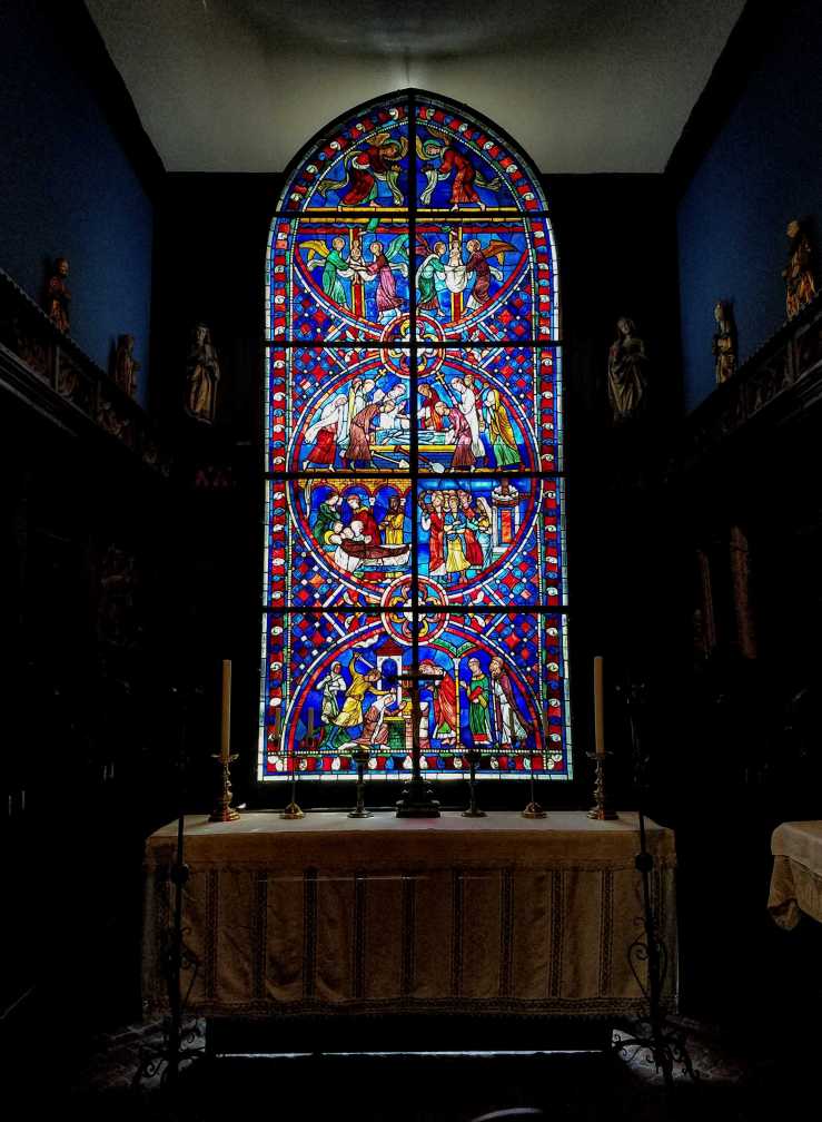 at the far west end of the Long Gallery, houses a consecrated altar that was used by Isabella Stewart Gardner–a devout Anglo-Catholic–for the celebration of Mass. Its function as an active sacred space persists to this day. Every April, as specified in Isabella’s will, a memorial service honors her memory. Liturgical items, including an early 17th century Italian carved ivory crucifix and a cloth that Gardner crocheted herself, adorn the altar table. A magnificent Gothic stained-glass window from the cathedral of Soissons in France stands as the centerpiece of the Chapel.