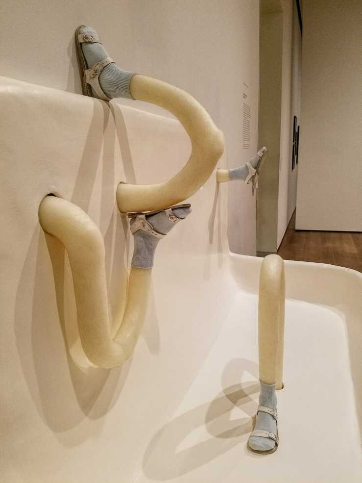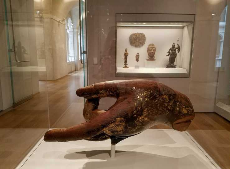 ”The third and fourth fingers of this enormous left hand in the centre of the gallery, sculpted in a palm-up posture, would originally have curled upward to the thumb as part of a symbolic hand gesture, or mudra. Recent scholarly detective work has established that this hand belonged to a 16-foot standing Amida Buddha, installed at Shin-Daibutsu-ji Temple in Mie prefecture in central Japan. The sculpture’s right hand would have been held pendant, palm facing outward to complete the mudra, which is known in Japanese as the sakate raigō-in, or ”gesture of welcome to the soul of the deceased with upturned palm”.”