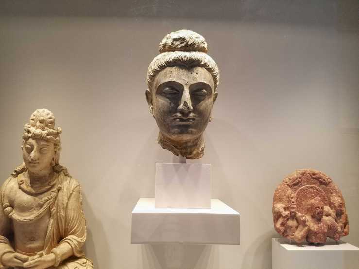 ”With small mouth, slender nose, crisp, planar intersection of forehead and eyes and wavy locks of hair, this idealized image of a Buddha bears all the Classical features of Greek-inspired Gandharan sculptures.”