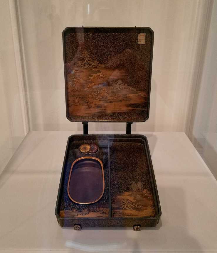 Lacquer on wood with decoration in gold, silver and sabi urushi (thick lacquer paste) utilizing the hiramaki-e (low-relief sprinkled design), takamaki-e (high-relief sprinkled design) and nashiji (”pear-skinned” ground) techniques, with applied kirikane (cut gold and silver) and with sheet-lead inlays; stone and metal fittings