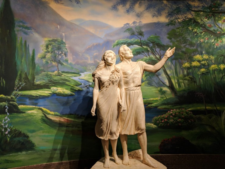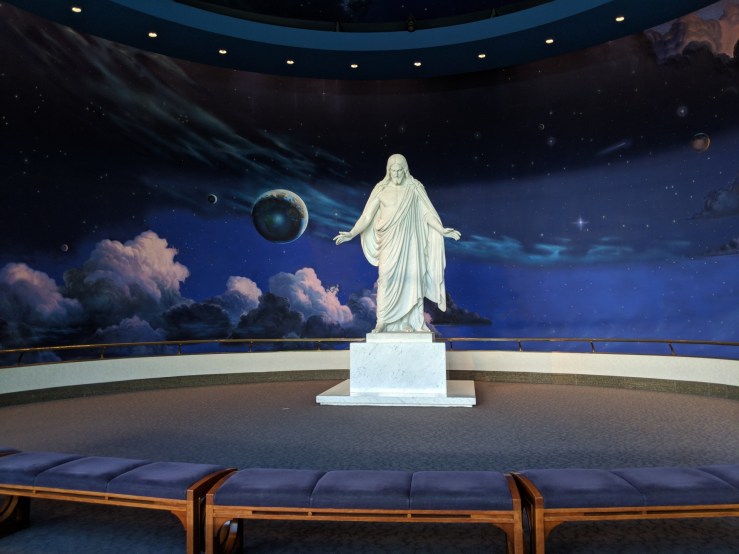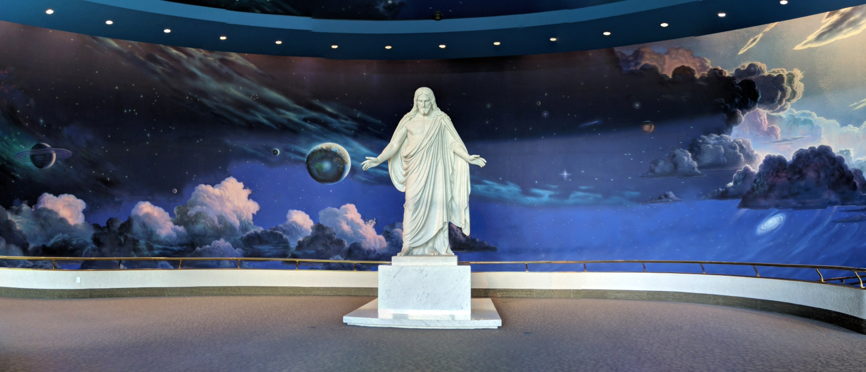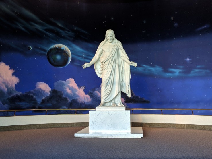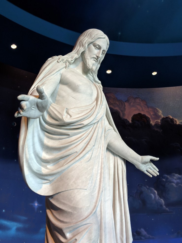 A replica of Thorvaldsen’s Christus, commissioned by LDS Church ”to help visitors understand that Latter-day Saints are Christians”. A towering marble figure of 3.4-metres (11-foot) replica displayed in front of a star-studded mural. It certainly is convincing.