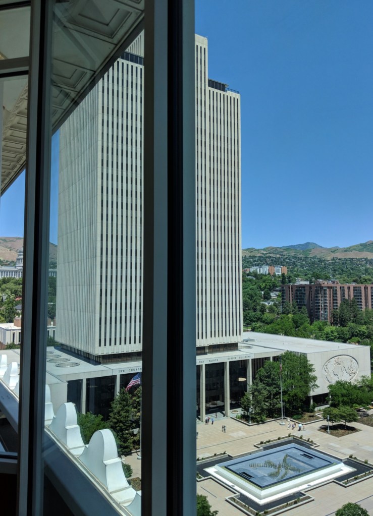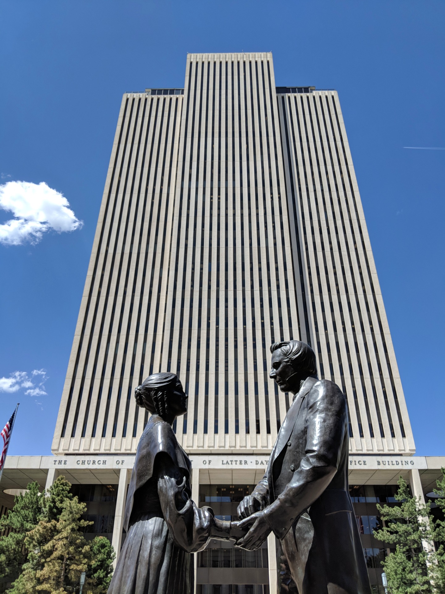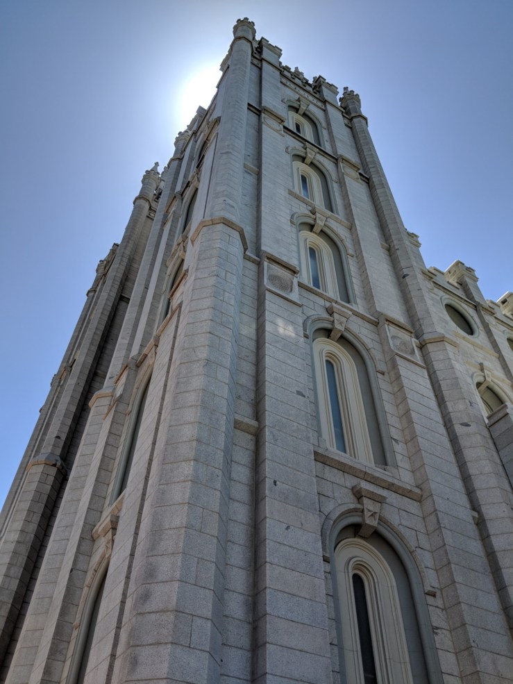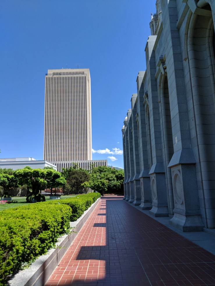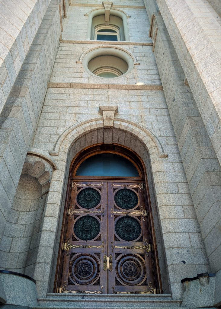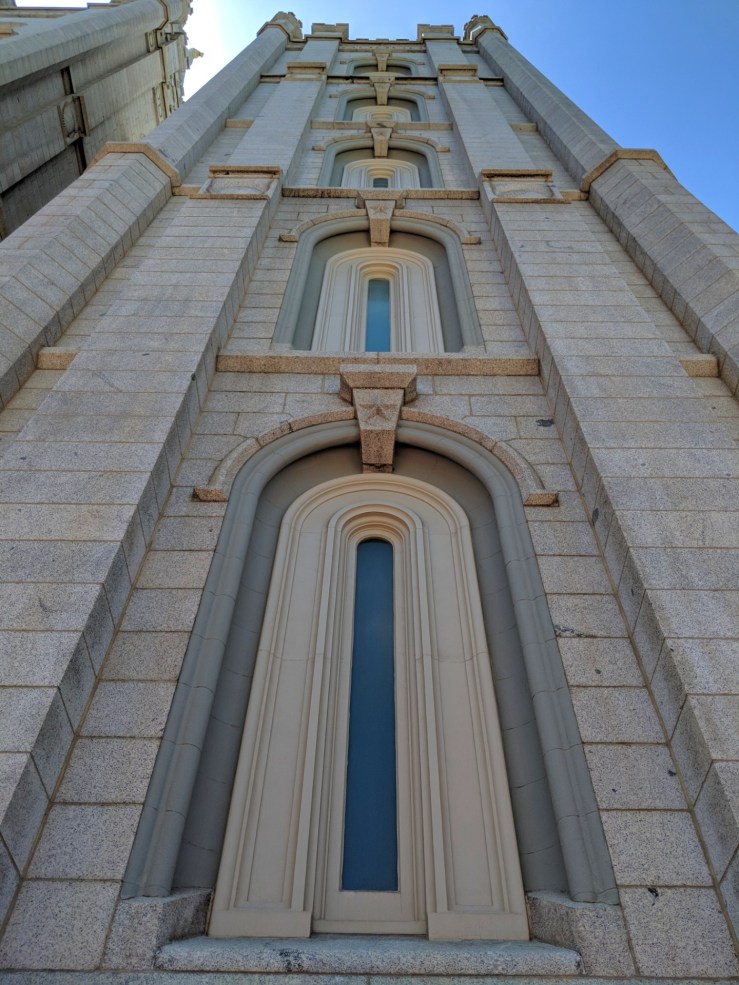 But, first, a view of the exterior of the grand Joseph Smith Memorial Building, the interior of which we explored yesterday, then the simple vertical lines of The Church of Jesus Christ of Latter-day Saints – Church Office Building, its minimal design in contrast to its convoluted name; and, finally, the most sacred of them all, the Salt Lake Temple; a place of worship and, as such, open only to members of the Church of Jesus Christ of Latter-day Saints, and certainly not to tourists. For the curious, there’s always the South Visitors’ Center, where a scale model of the temple and its interior is available for all to see. That’s where we’re going tomorrow. But, for now, please enjoy the views from the Temple grounds.