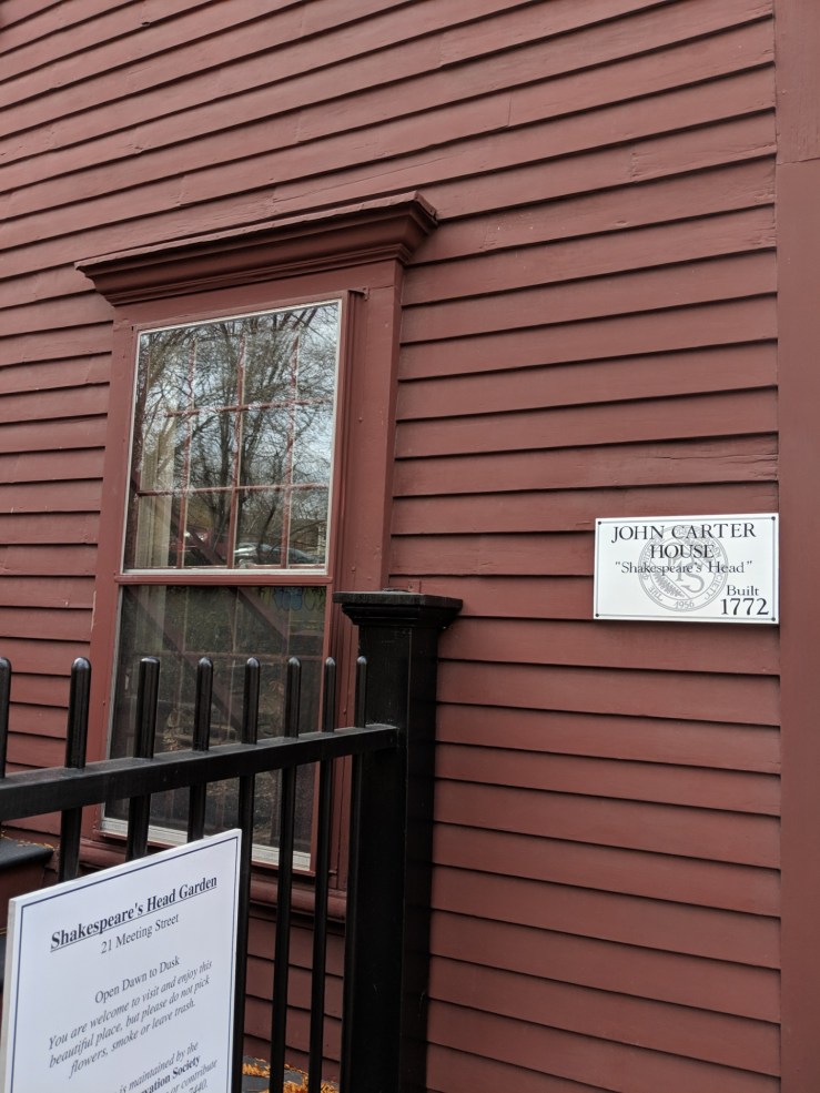 The ”John Carter House”, in 21 Meeting Street, aka ”Shakespeare’s Head” since colonial times when the building was used as a print shop and post office by John Carter, who had trained with Benjamin Franklin in Philadelphia. The enterprises were advertised by a sign featuring the head of Shakespeare on a pole outside the building. This is where the city’s first newspaper, The Providence Gazette, was printed until 1793.