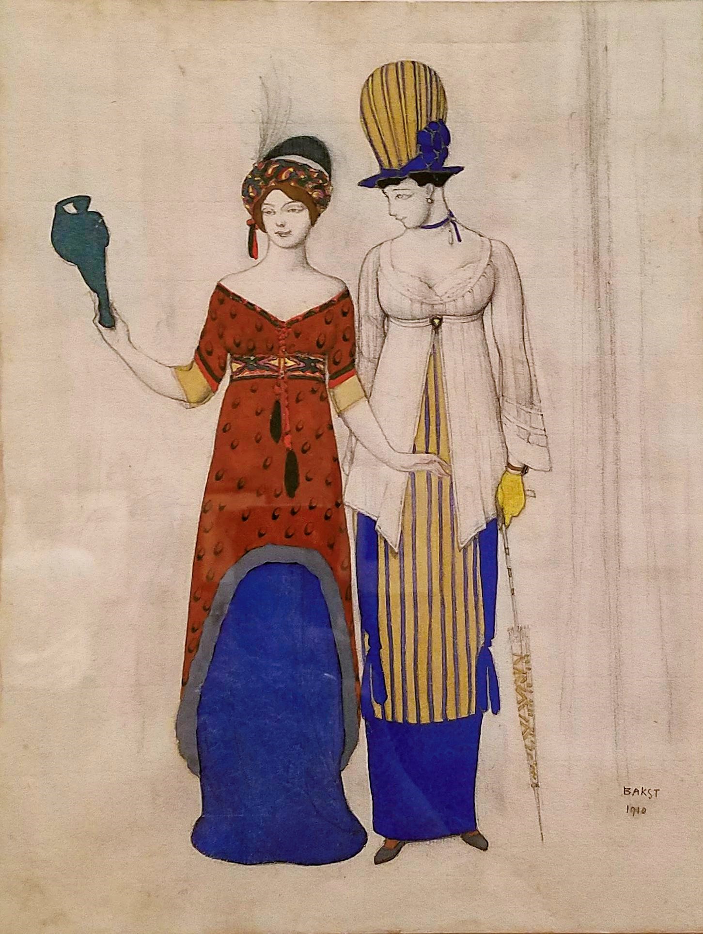 ‘Fantaisie sur le costume moderne‘: Two female haute couture figures, 1910. Graphite, brush and watercolour and gouache