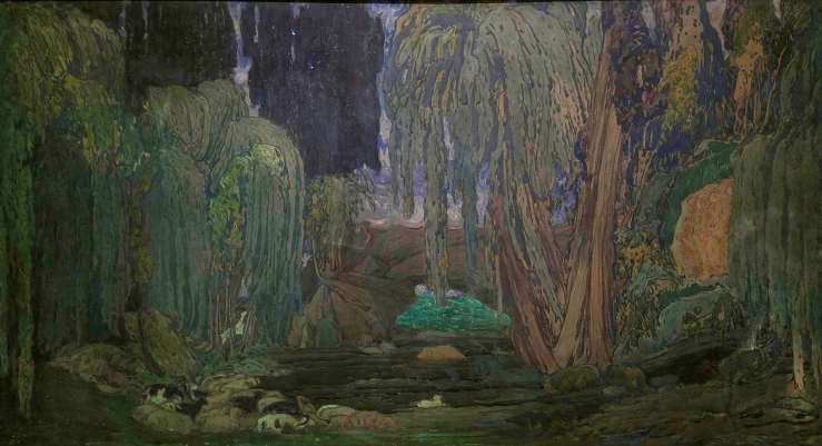 Bakst designed this impressive decor for Narcisse, a one-act ballet about the Greek mythological figure Narcissus, who falls in love with his own reflection in a pool of water. The story is set at the shrine of Pomona, a mythological goddess associated with the abundance of nature. The rich green landscape Bakst created echoes the sensibilities of the Art Nouveau style.