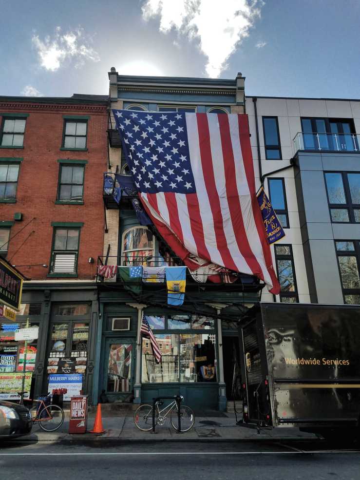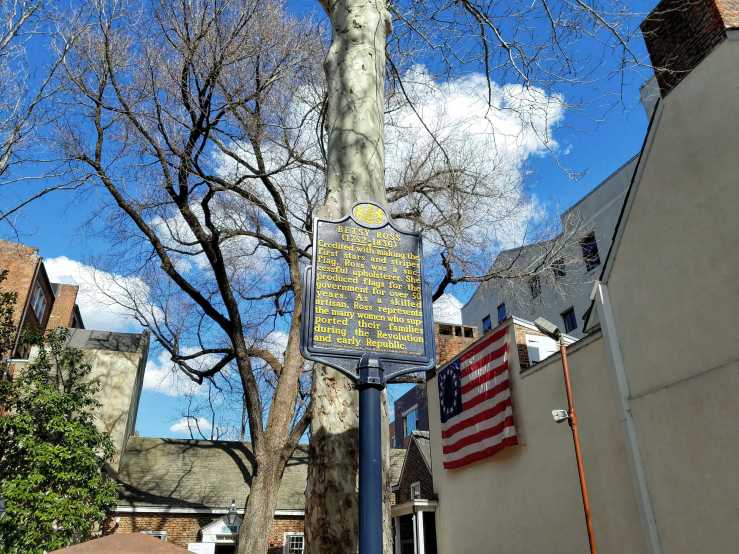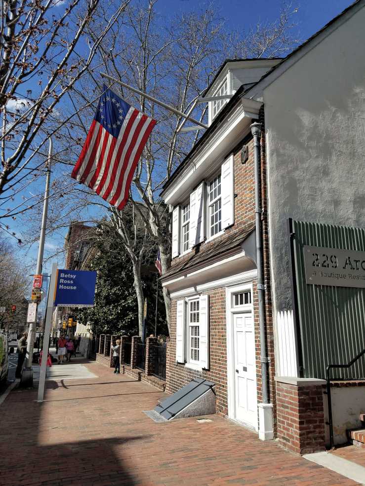 To Betsy Ross’ House. Ms Ross was a seamstress, credited with sewing the first American flag – to Mr. Francis Hopkinson’s design, as we learned from his epitaph earlier. While no proof exists of Ms. Ross’ accomplishment, the fact remains that she is a beloved figure and her legend lives strong. And, right across her house, a giant flag. Can you get more patriotic than that?