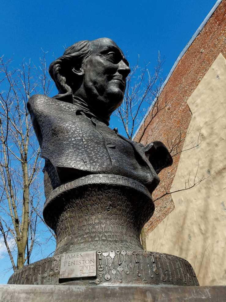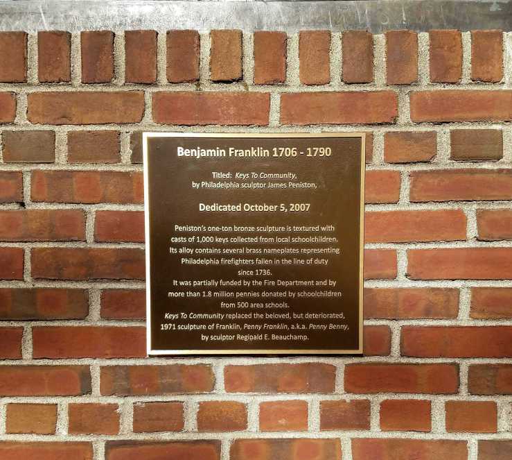 Here is Mr. Franklin again, his bust sculpted by James Peniston, covered with casts of 1.000 keys collected from local schoolchildren. ”Keys To Community” also contains several brass nameplates representing Philadelphia firefighters fallen in the line of duty since 1736: Philadelphia