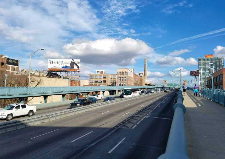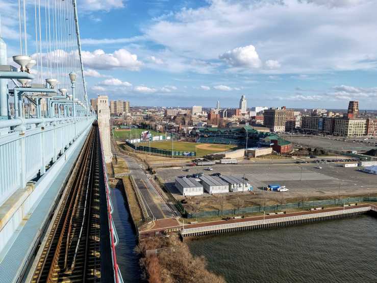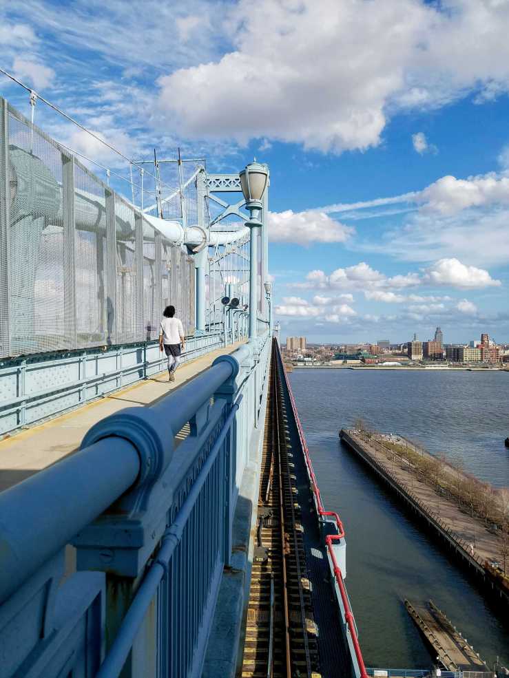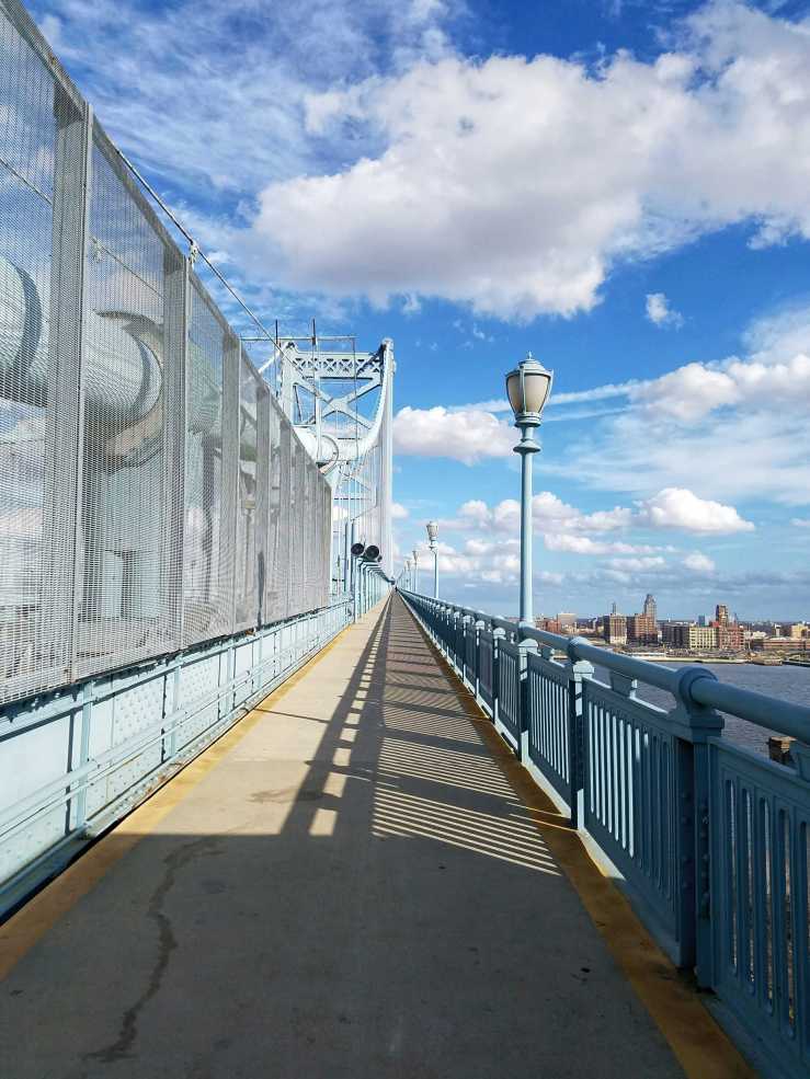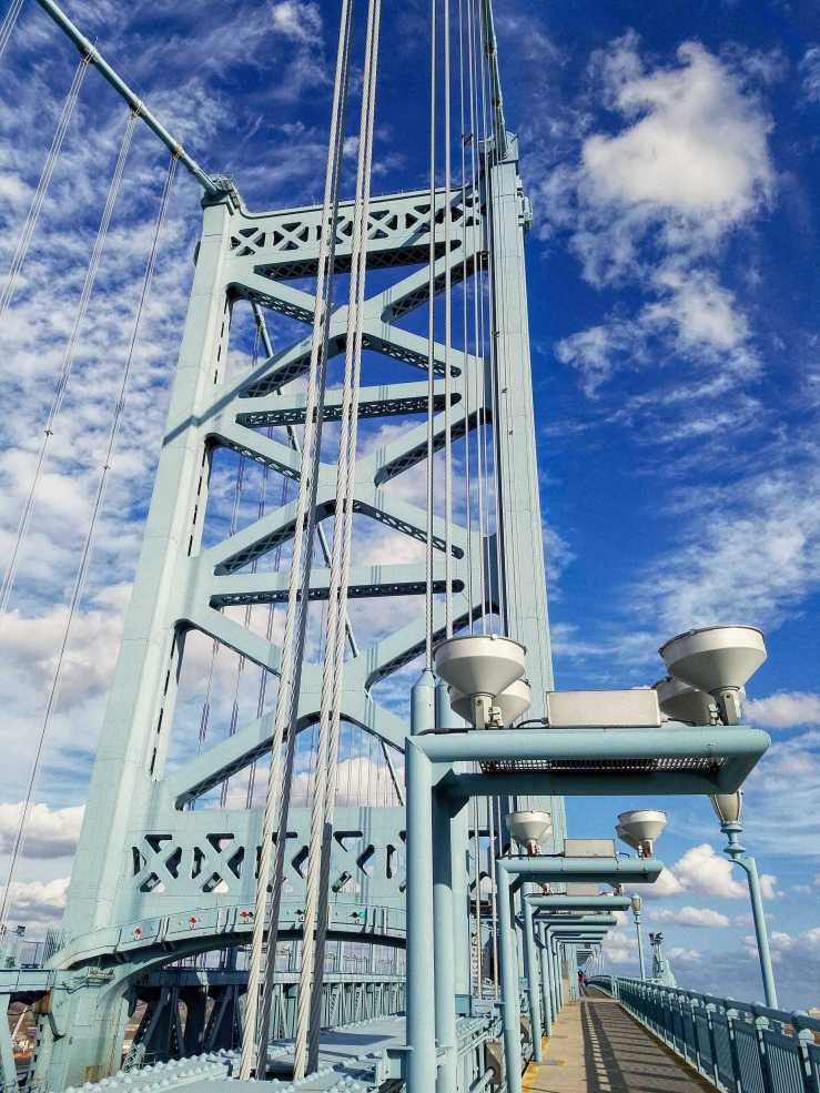 Dear Ben is omnipresent in Philadelphia. Monuments, museums, his memorial, this bridge, they all honour one of America’s most illustrious figures.The bridge named after Benjamin Franklin spans across Delaware River and connects two Cities and two States: Philadelphia, Pennsylvania and Camden, New Jersey. It can be crossed by car, train, bike or, like we did, on foot. Around 1,3 miles or 30′ walk, longer if you pose to take photos, soak up the views, try to identify Philly’s tall buildings in the background or just take deep breaths of fresh air. Or maybe watch a game.Camden Waterfront, on the other side, was undergoing a major redevelopment and didn’t look too welcoming at the time so we just turned back without exiting the bridge.
