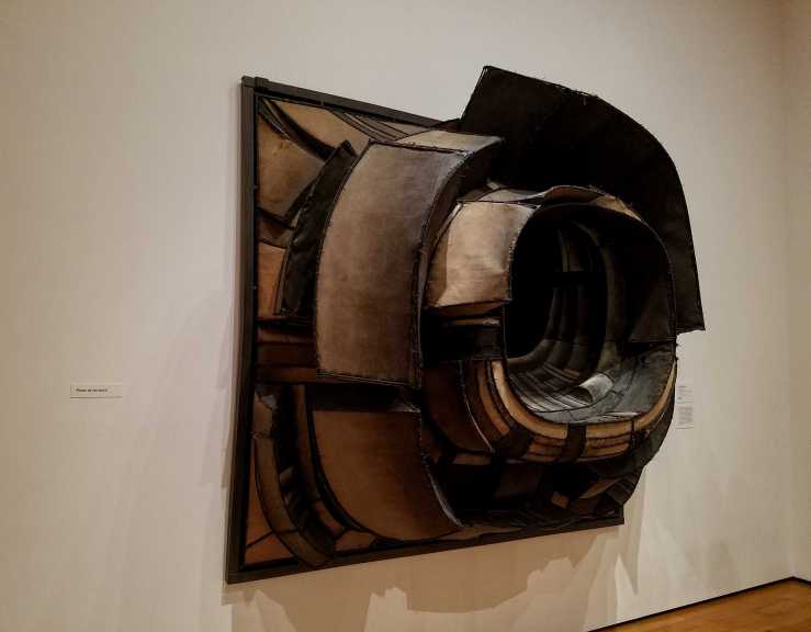 <<When Bontecou first exhibited her steel-and-canvas sculptures, many praised their aggressive, ominous qualities. Fellow artist Joseph Cornell described their gaping black cavities as summoning “the terror of the yawning mouths of cannons, of violent craters, of windows opened to receive your flight without return, and the jaws of the great beasts.”>>