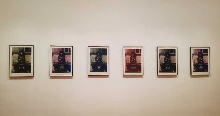 The row of framed prints on the wall show VALIE EXPORT, photographed by Peter Hassmann for her signature work Action Pants: Genital Panic, 1969.