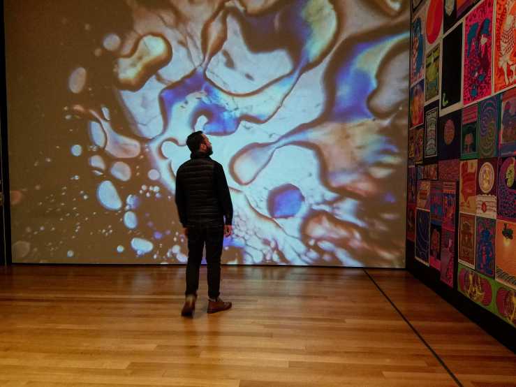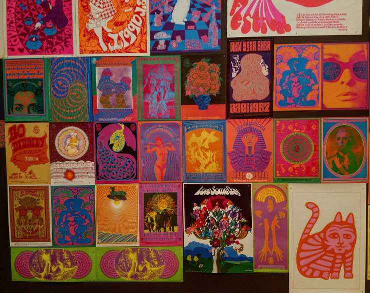The row of framed prints on the wall show VALIE EXPORT, photographed by Peter Hassmann for her signature work Action Pants: Genital Panic, 1969.