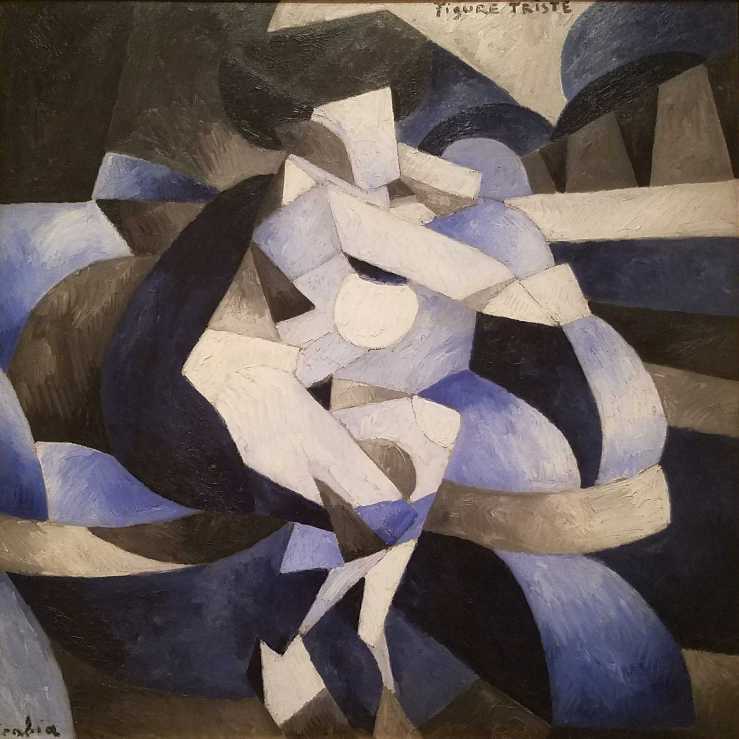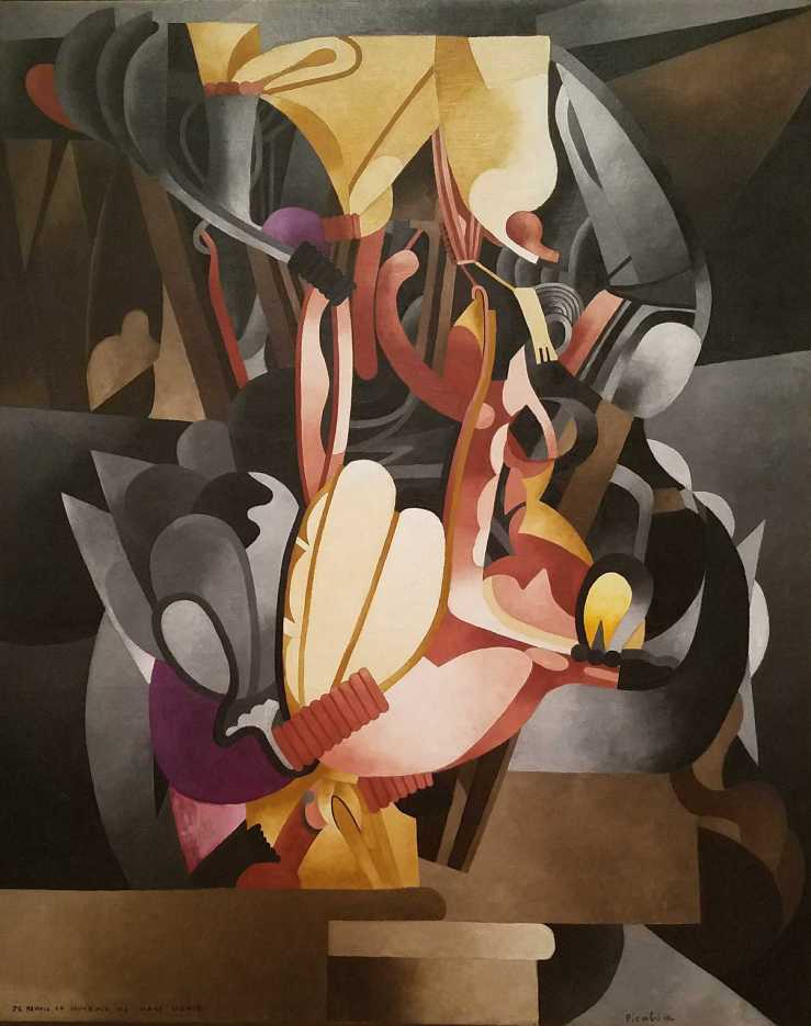 [Note from the accompanying tag: Picabia associated ”Udnie” – a name of his own invention – with memories of watching the dancer Stacia Napierkowska, whose suggestive performances subsequently provoked her arrest, rehearse onboard during his transatlantic journey to New York in 1913. ”Udnie” is also an anagram of the last name of Jean d’Udine, whose theory of synesthesia (published in 1910) linked painting with music and dance through the concept of rhythm. In this painting, rhythm is intimated via a series of repeated, interpenetrating pistons and quasi-visceral orifices, fusing the mechanical with the biological.]