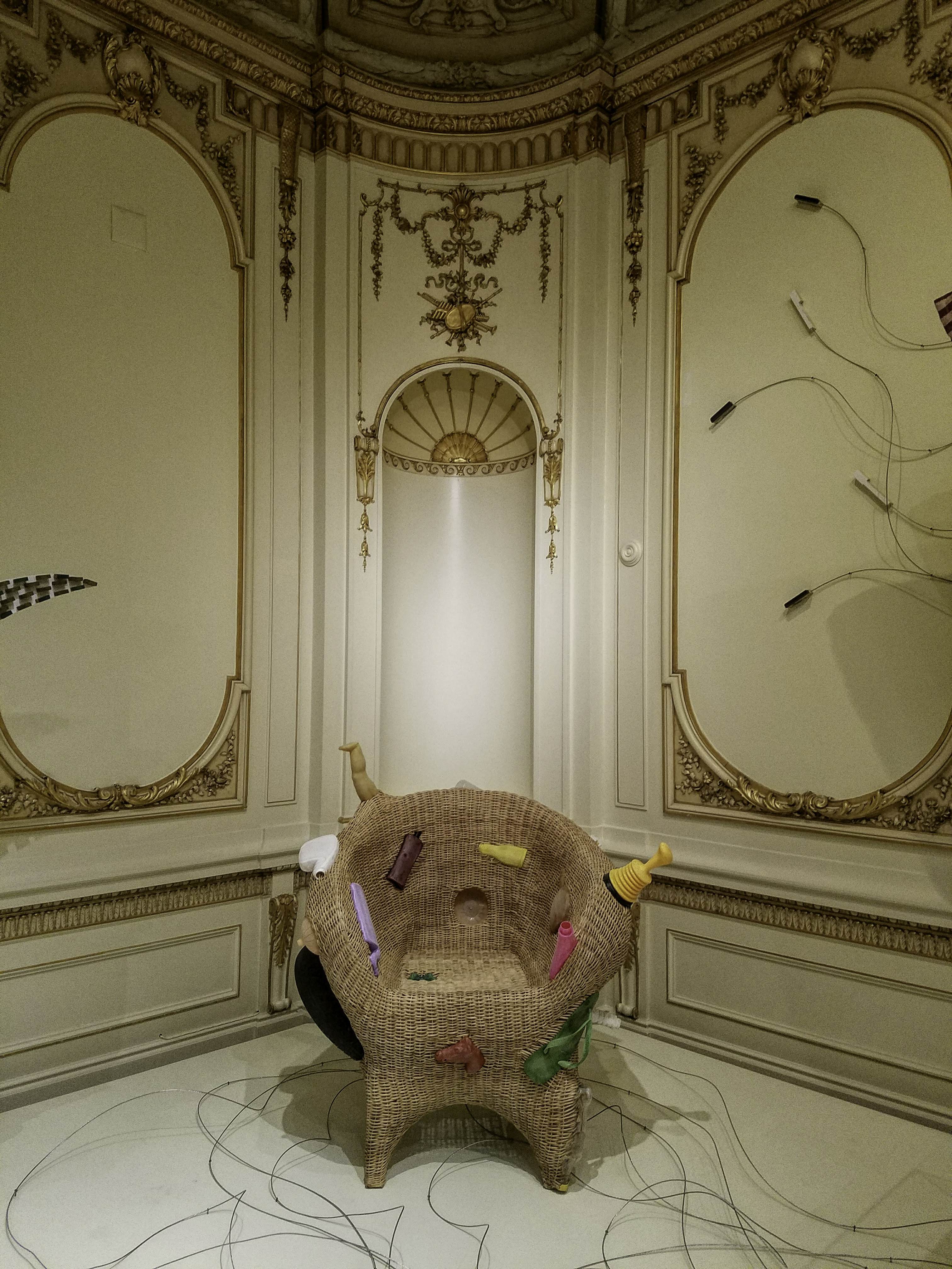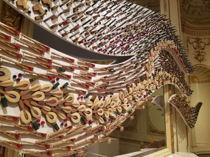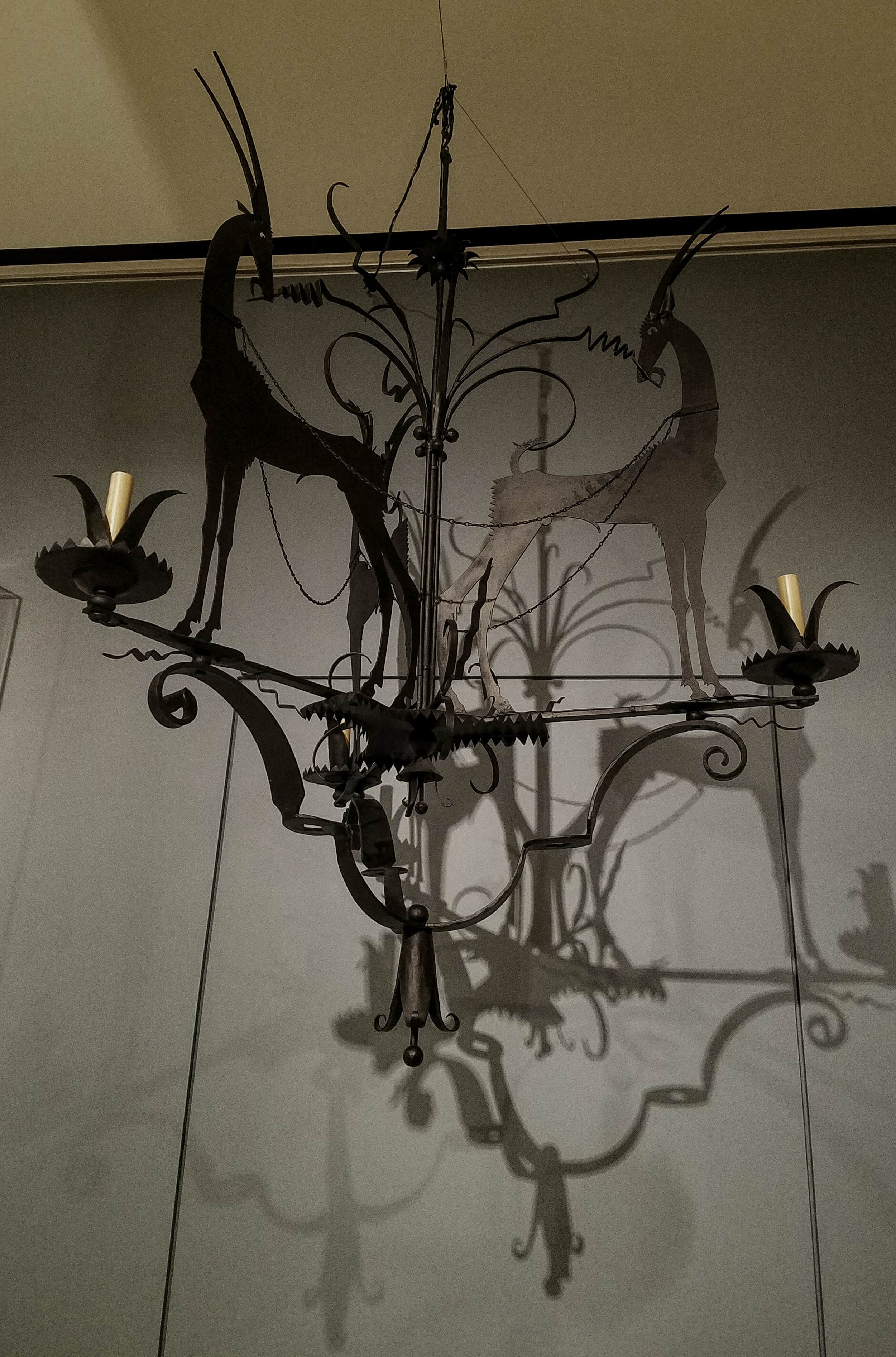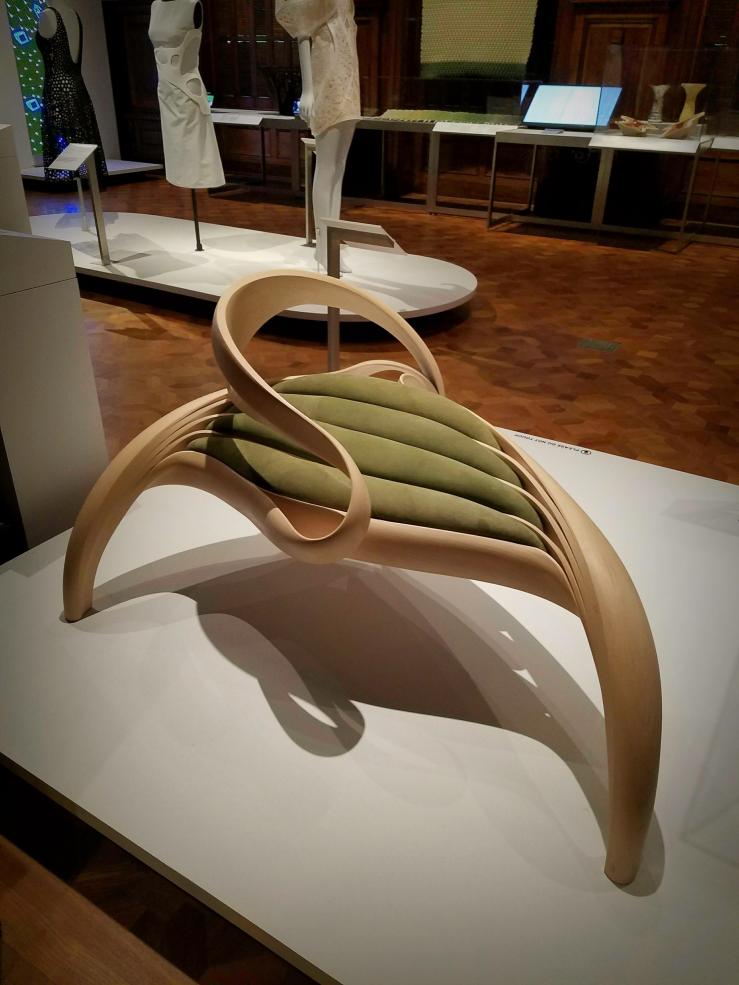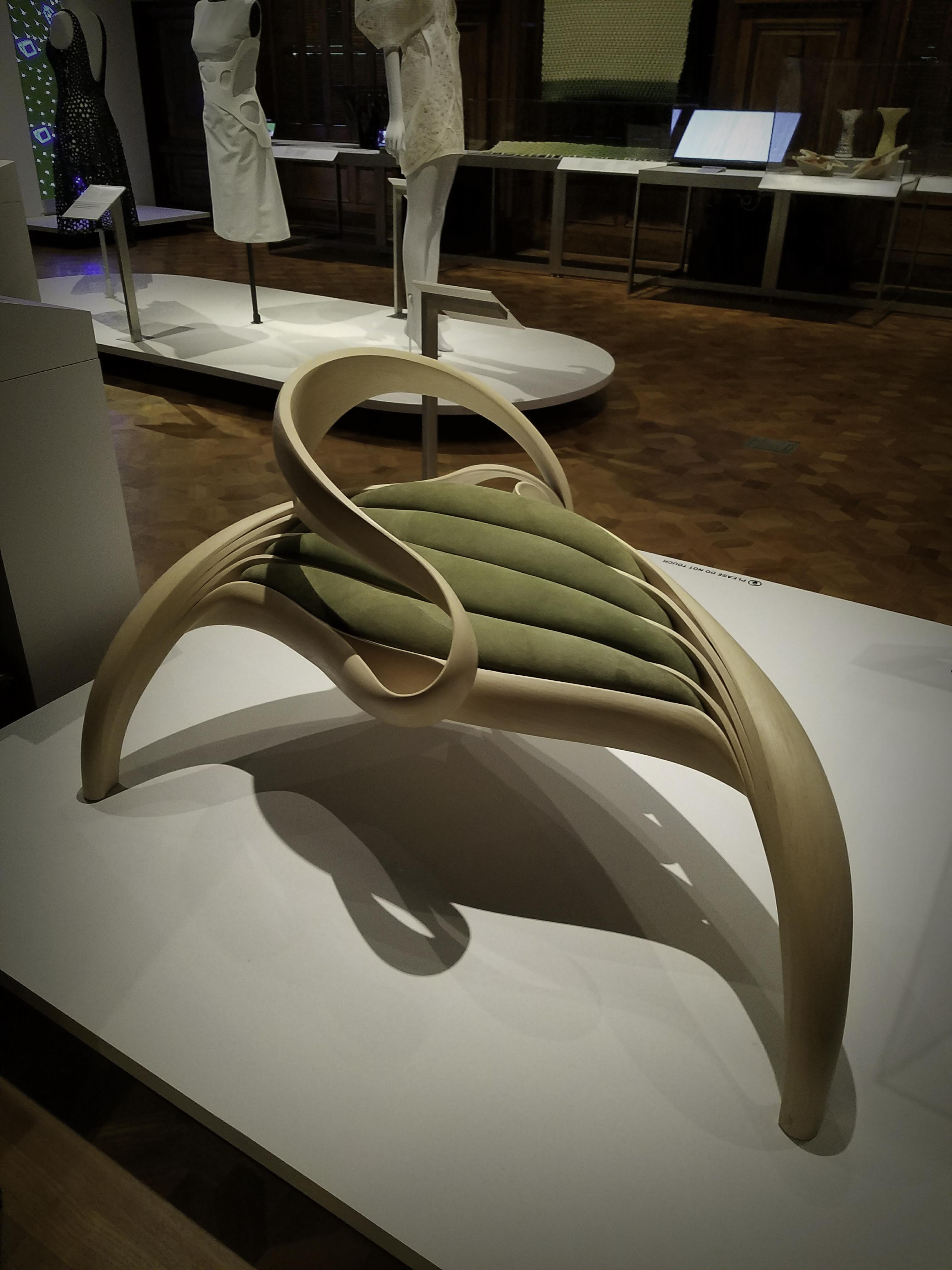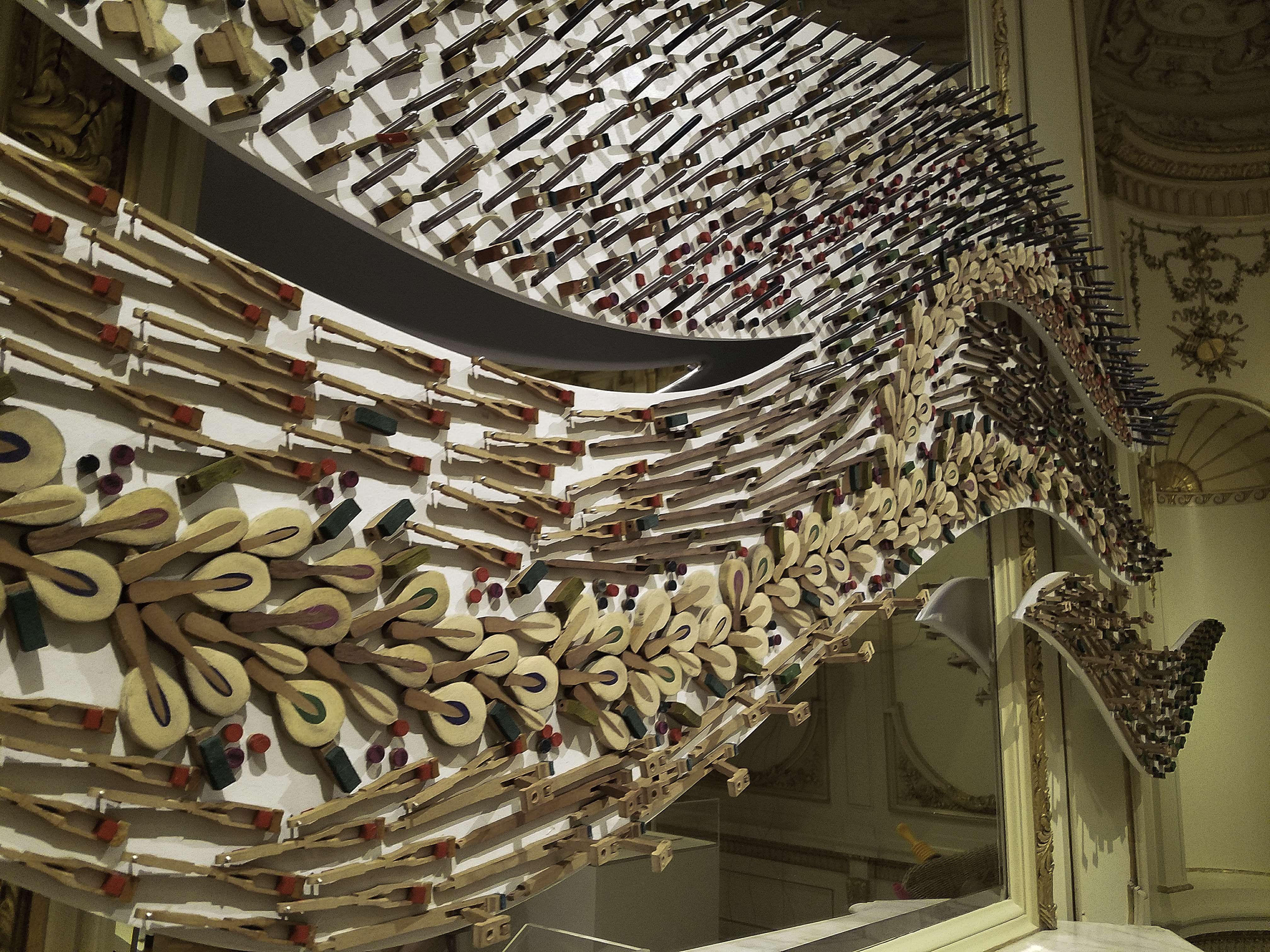 Carved, joined, bent, planed and carved pear, wrought brass wire, turned bone