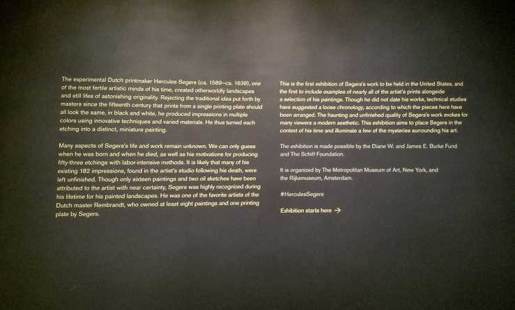 Parallel to Seurat’s Circus Sideshow, The Met was showing works by the Dutch printmaker and painter Hercules Seg(h)ers (ca. 1589 – ca. 1638). Very little is known about his life but his dreamy landscapes, innovative techniques such as lift-ground etching which would only be employed by others 150 years later, impressions in multiple colours contrary to the existing traditions that wanted them to look alike – in black and white, all speak for themselves.