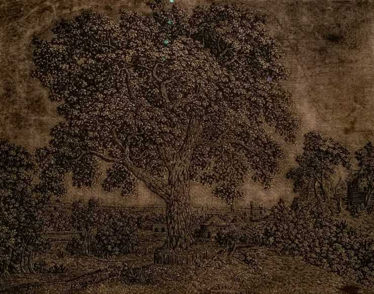 The Mossy Tree is one of Segers’ most striking and iconic prints, due to its loose, almost calligraphic lines, which convey the unruly nature of moss. Linked together solely with thin lines, the branches seem to float before the delicately coloured background. The artist original printed the tree in green ink, though it has turned brown over time.