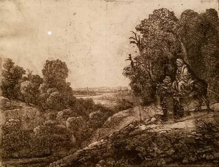 Rembrandt came into possession of Segers’ etching plate by about 1652 and altered the subject to the Flight into Egypt. He scraped away the large figures and added Joseph and Mary, as well as sketchy trees. In the second state, Rembrandt’s addition of rich drypoint lines almost obscures the subject.