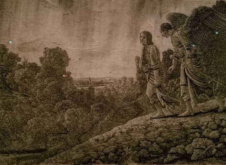 Tobias and the Angel, one of Segers’ final prints, was inspired by an engraving by Hendrick Goudt after Adam Elsheimer. Segers copied the two figures, including the large fish dragged along by Tobias, but enlarged them so that their silhouettes stand out against the sky.
