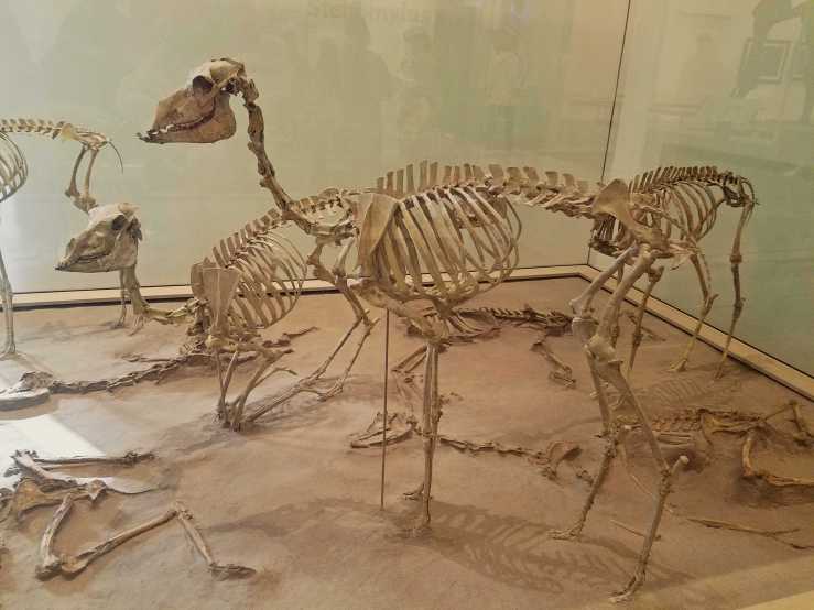 Stenomylus (Greek στενός – stenos “narrow” and μύλος – milos [latin: mola] “molar” meaning ”narrow tooth”. This group of camel skeletons was buried in dune sand in western Nebraska 22 million years ago. These individuals are only some of the numerous completely preserved camel skeletons that were found together at a site in Agate Springs National Monument. Stenomylus lived in a region where dune fields extended widely. It was relatively primitive in its body skeleton, but had the more advanced feature of very high-crowned teeth – presumably to cope with sand-laden food, which rapidly wears down the teeth.