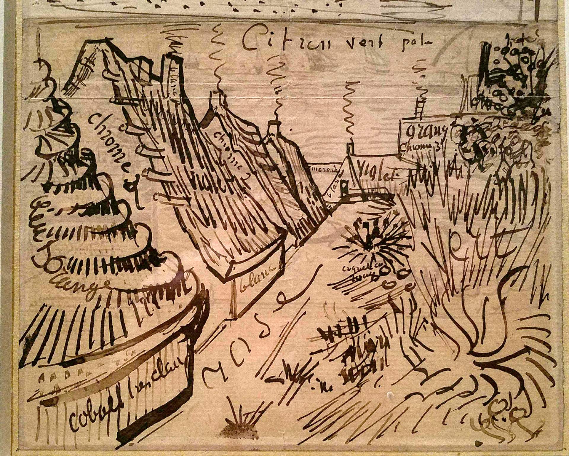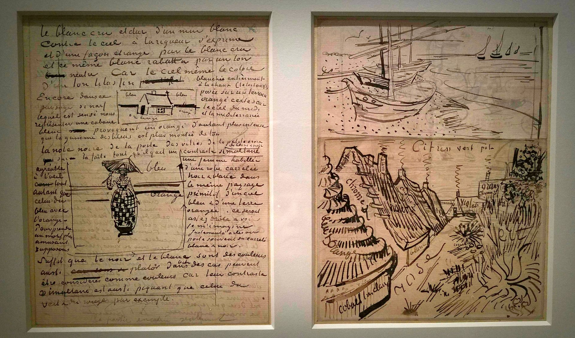 Energized by his visit to the seaside town of Saintes-Maries-de-la-Mer, van Gogh wrote enthusiastically to Bernard about his explorations of complementary colours (“No blue without yellow and without orange“) and his consideration of black and white as colours. He included several sketches to explain his ideas and enclosed a sheet containing drawings of canvasses in progress.