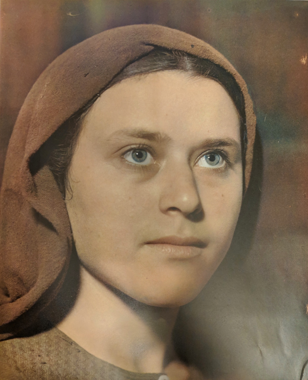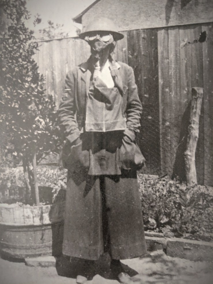 Gertrude Bray posing below in her daily work outfit.