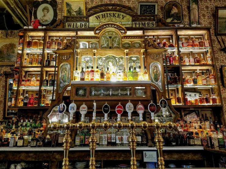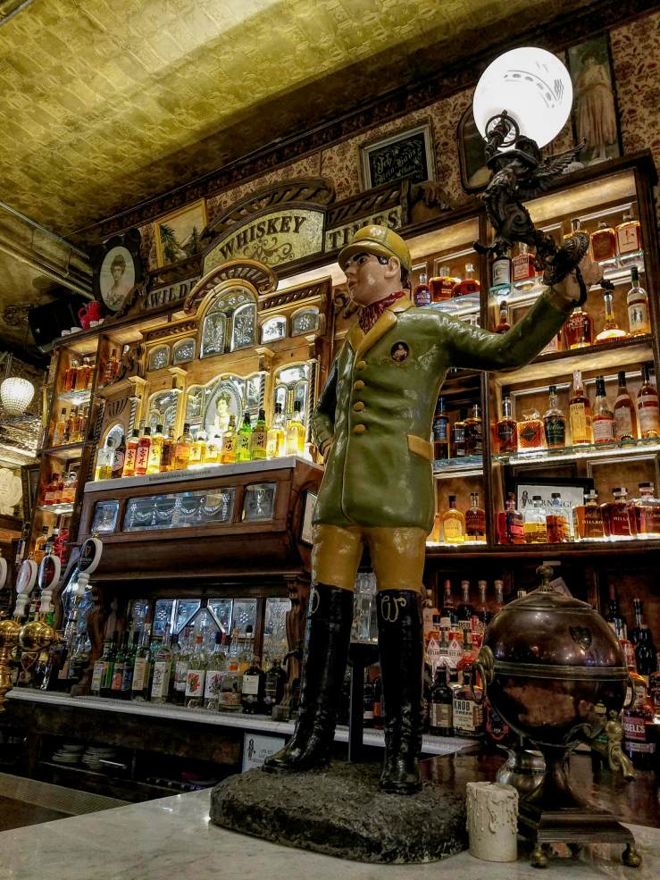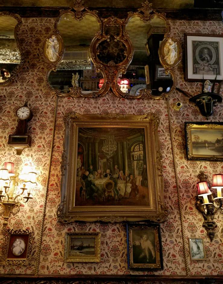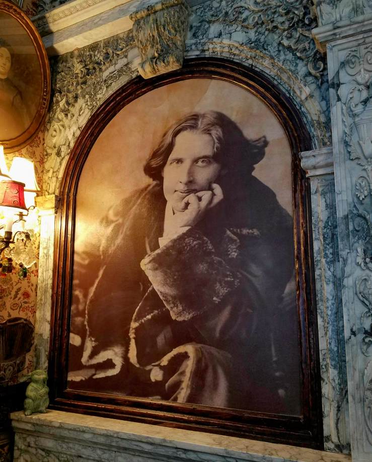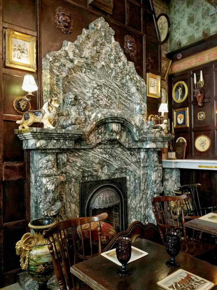 a wildly extravagant, lavishly adorned cabinet of curiosities, bursting with antique and vintage objects collected from all over the world. That marble fireplace? French, 1840s, acquired on Bond St. from Bonhams and Phillips Auctioneers. That Whiskey Bar? Expands around a Player Piano of 1819 and holds over 300 varieties of whiskey. Stained glass from Milan, wallpaper made in Mexico, original wood paneling from Hope Castle in Ireland. See that antique clock on the Irish Writer’s Wall? It’s only one of 26, all set to 1:50, the time of Oscar Wilde’s death.