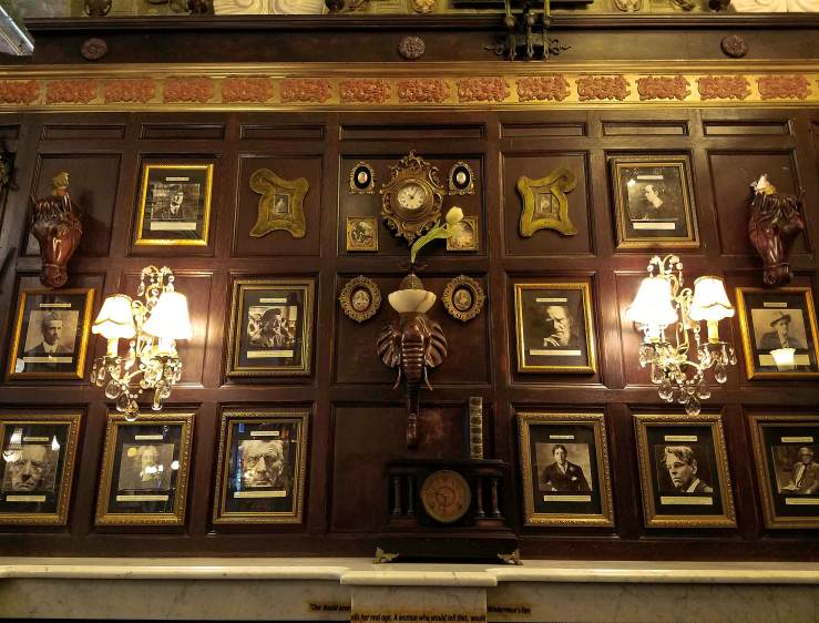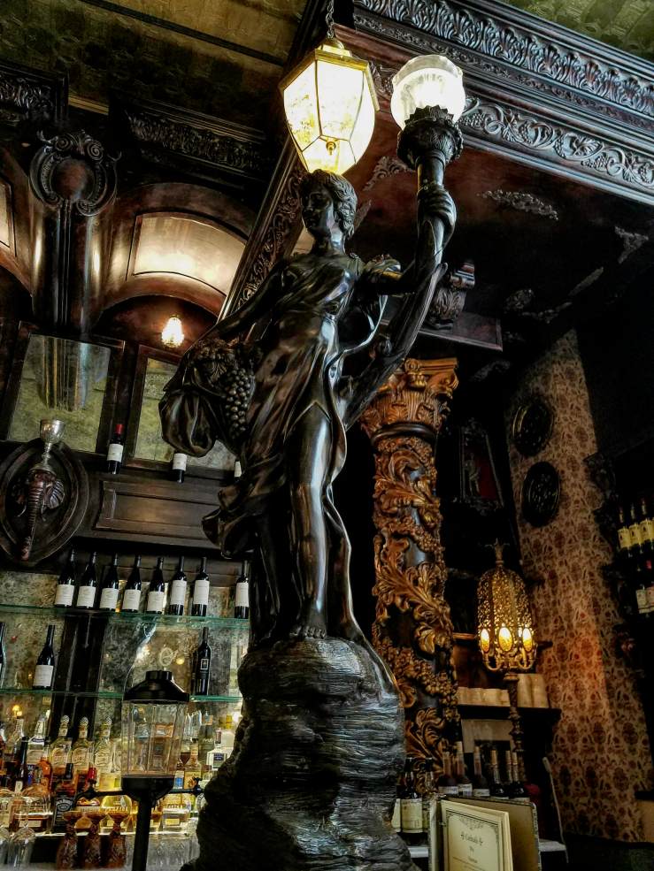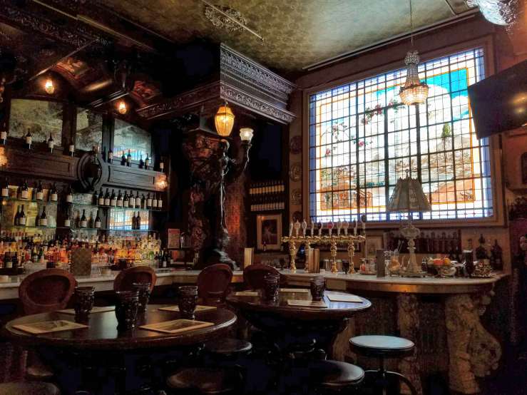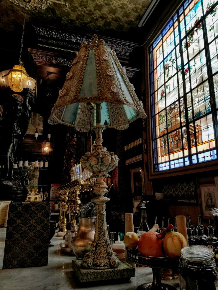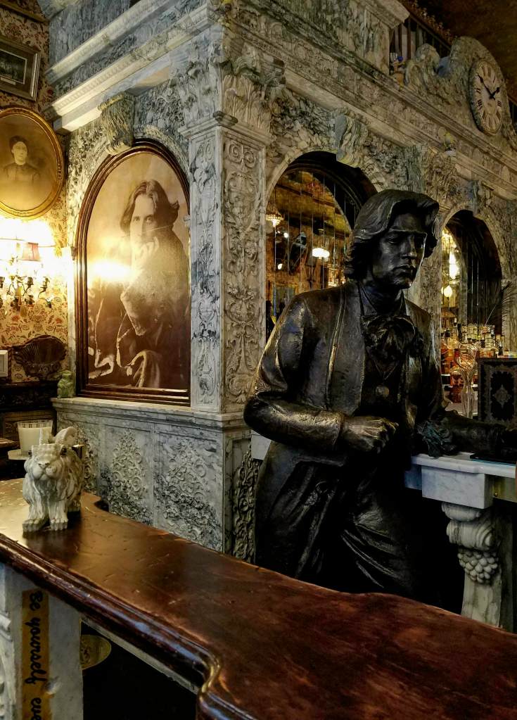 a wildly extravagant, lavishly adorned cabinet of curiosities, bursting with antique and vintage objects collected from all over the world. That marble fireplace? French, 1840s, acquired on Bond St. from Bonhams and Phillips Auctioneers. That Whiskey Bar? Expands around a Player Piano of 1819 and holds over 300 varieties of whiskey. Stained glass from Milan, wallpaper made in Mexico, original wood paneling from Hope Castle in Ireland. See that antique clock on the Irish Writer’s Wall? It’s only one of 26, all set to 1:50, the time of Oscar Wilde’s death.
