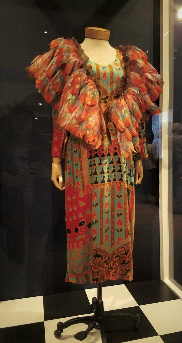 The feather ”shawl” was originally a trim at the bottom edge of this dress. Sherman had it cut off and used it as a shawl.