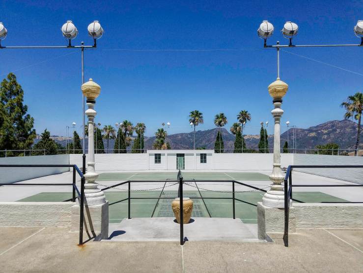 The clean, straight lines of the empty tennis court. And the sturdy curves of the wrought iron furniture, one set in each corner.